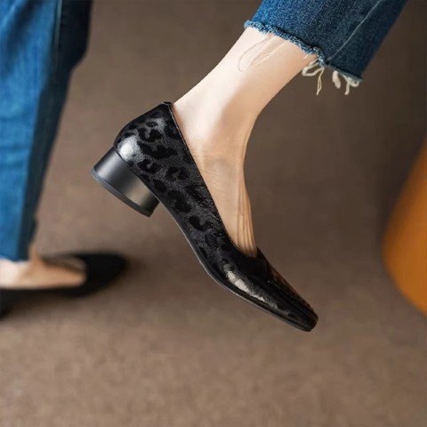 ・薄めのシャープなスクエアトゥのきれいなパンプス。