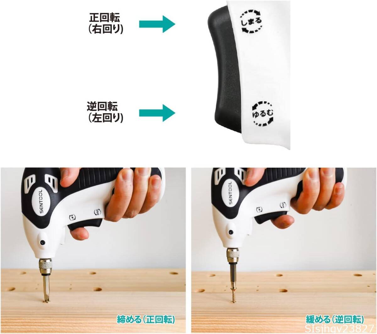 【正逆転切替簡単すばやい】スイッチの上側を押すと時計回り、下側を押すと反時計回りに回転する。スイッチを離せば回転は止まる。市の 電動ねじ回し は左右切替スイッチを押してから回転方向を変更する必要があります。