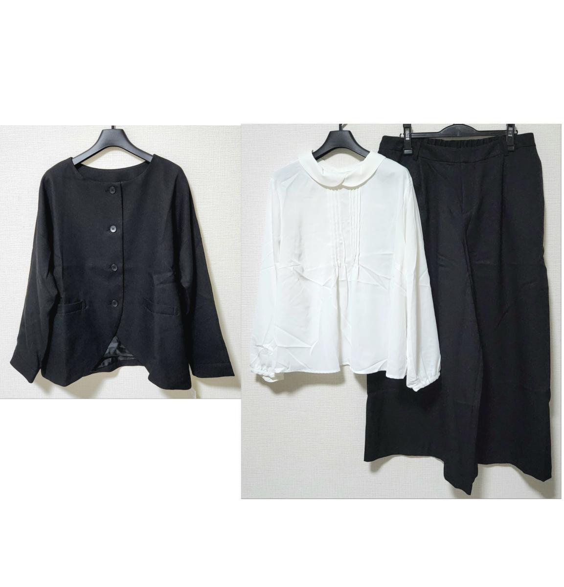 ノーカラージャケット、ホワイトのブラウス、ワイドパンツの3点セットです