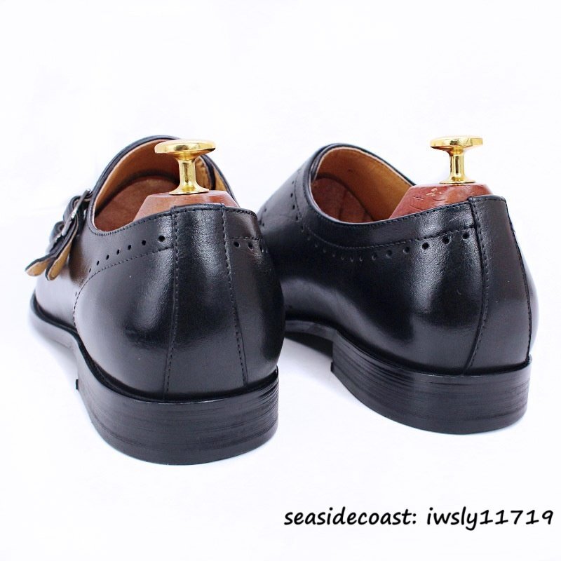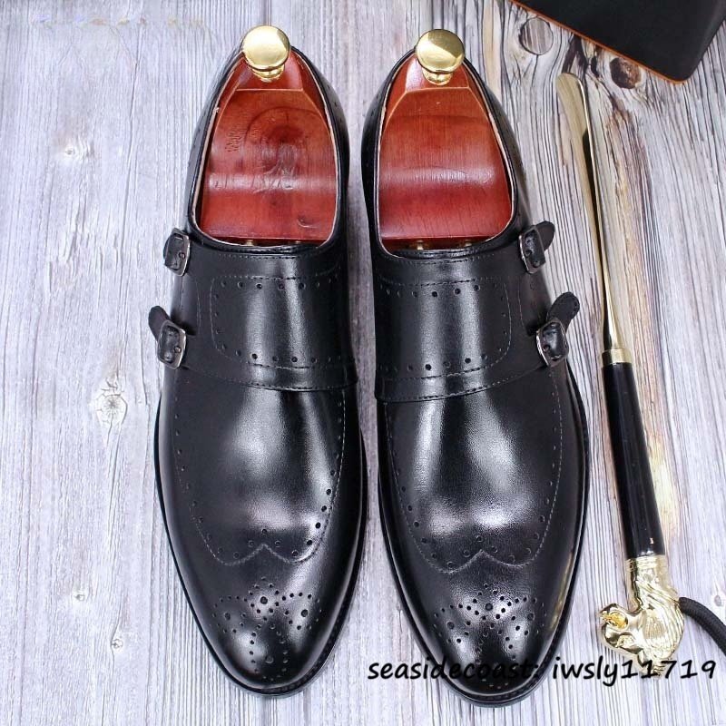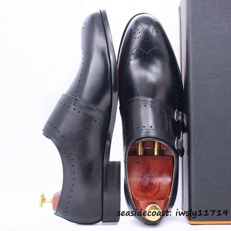 超希少◆定価9万 新品 モンクストラップ メンズ 本革 レザーシューズ 職人手作り 彫り ビジネスシューズ 牛革 紳士靴 革靴 ブラック 24.5cm