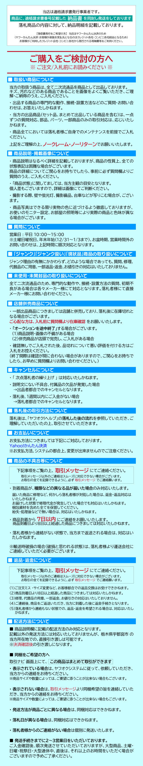 取引ナビで配送方法を選んで下さい。 クリックポスト 宅急便コンパクト ※注意事項※ クリックポストには補償が付いていませんので、 郵便事故などの場合、一切の責任は持てません。 補償をご希望の方は宅急便コンパクトを 選択してください。 宅急便コンパクトの場合 商品代金+発送料金をかんたん決済にてお支払い後に、 ヤマト運輸の宅急便コンパクト発払いにて発送致します。 送料は ヤマト運輸公式サイトをご確認ください。 発地は関東となります。 (送料は上記の金額に梱包材料金70円を上乗せした金額となります) クリックポストの場合 送料は全国一律で185円です。 まとめて取引(まとめて発送)の場合 クリックポスト・宅急便コンパクトは御利用できない場合がございます。 落札後店舗にて直接引き渡しも可能です。 |