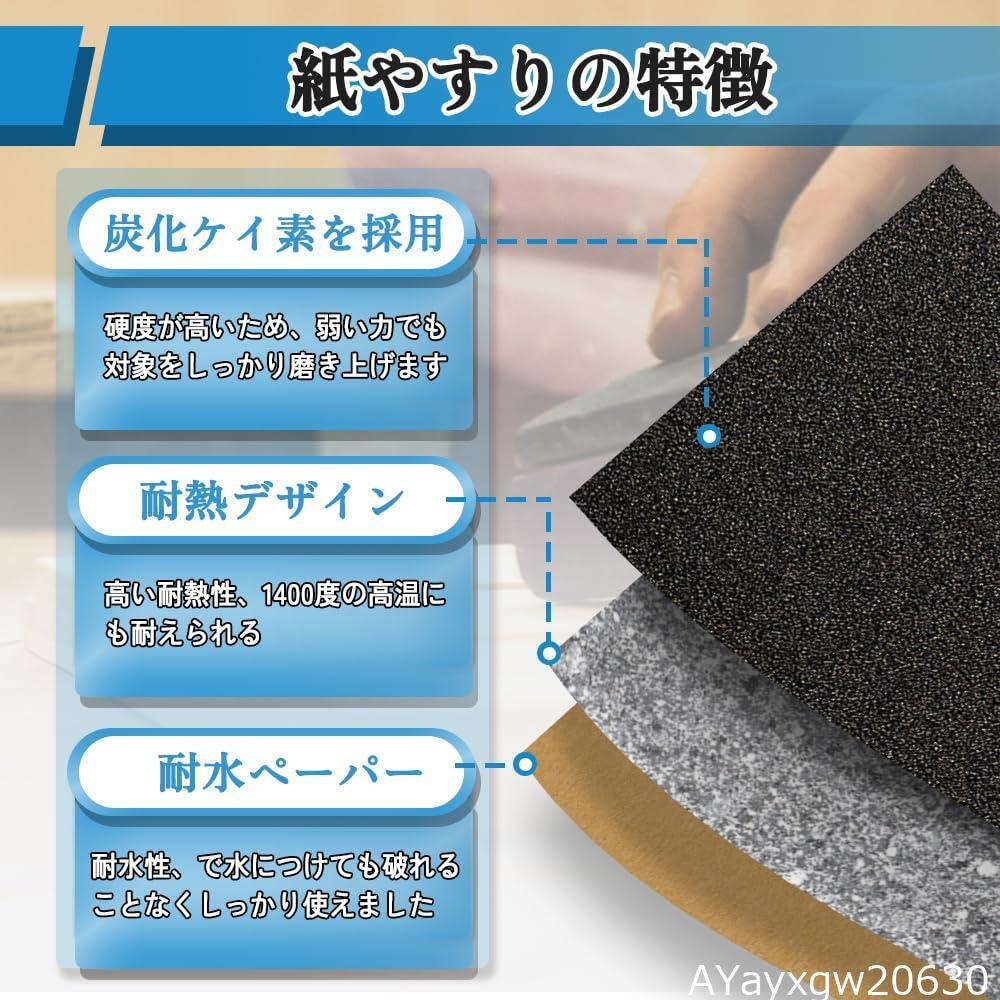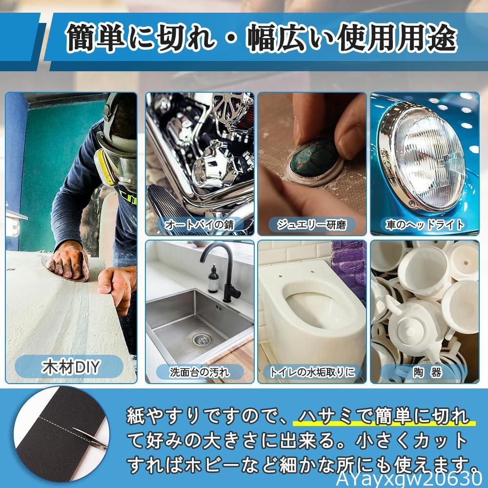 幅広い用途:サンドペーパー粗い番手から、細かい番手までセットになっており、サビ、腐食部分の研磨に最適です。バイクのメンテナンス、車のスプレー塗装前に使用、金属のヤスリをかけた後使用に、金属の錆の除去、水垢ペーパー、トイレの塊汚れに使うとピカピカになるよ。木材DIY、ガラス、鏡面、金属、陶器、木工から塗装面の磨きまでなんでも使えそうです!