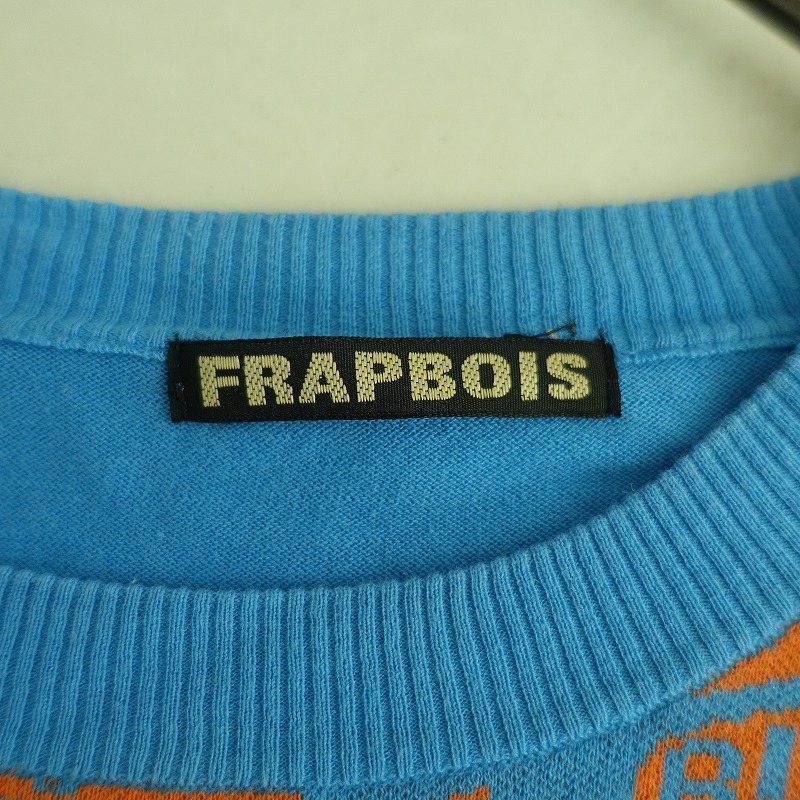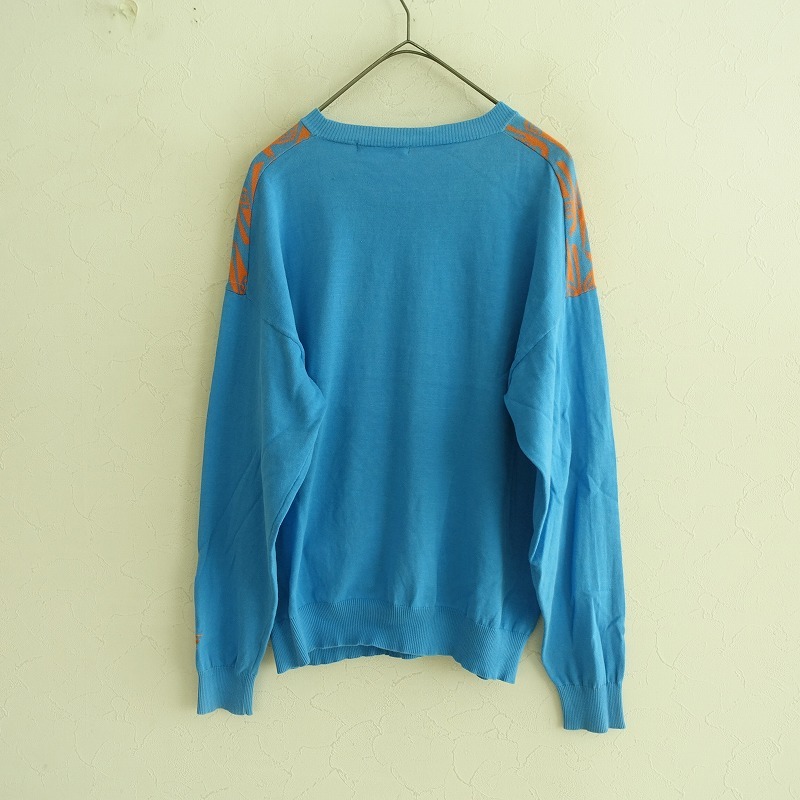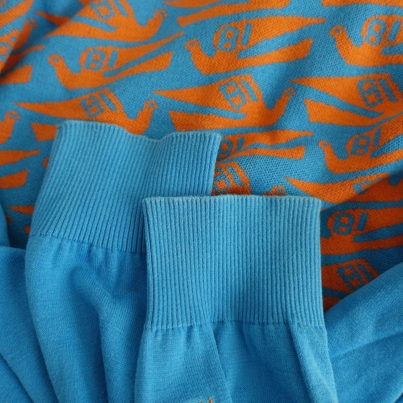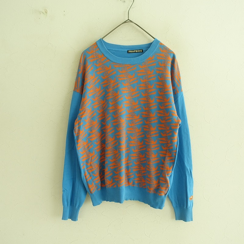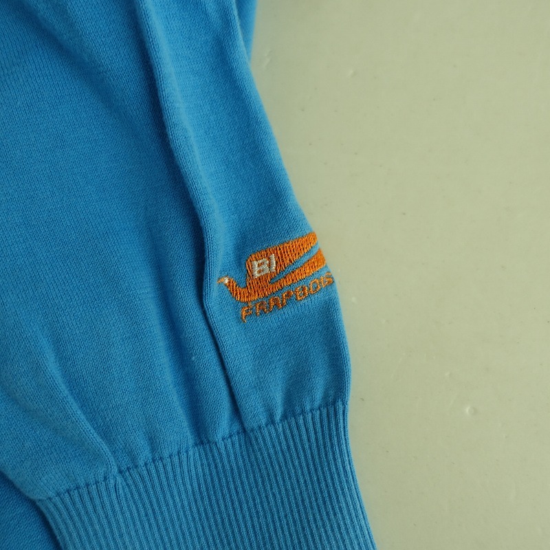 FRAPBOIS×BRANIFFのインターナショナルニットプルオーバーです。カラーはライトブルー×オレンジで、ブラニフのロゴを千鳥格子のように配置した70年代を彷彿させるレトロでクラシックなジャガード編みニットで仕立てられております。左袖口に刺繍があしらわれております。 |