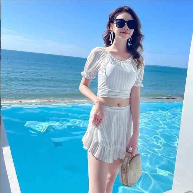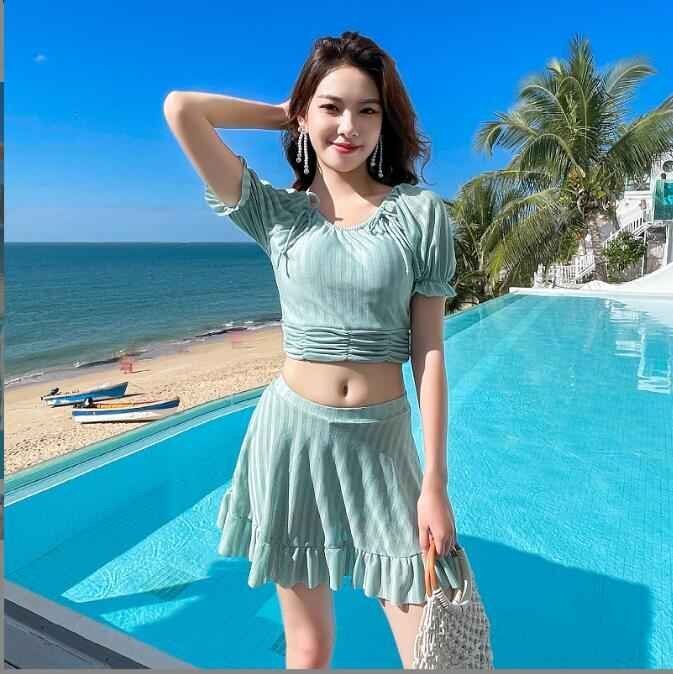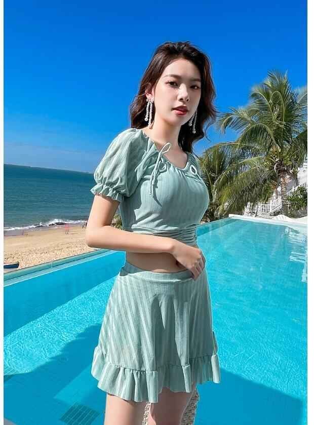 レディース 体型カバー 水着 2点セット スカート水着 フリル ビキニ スイムウェア S グリーン