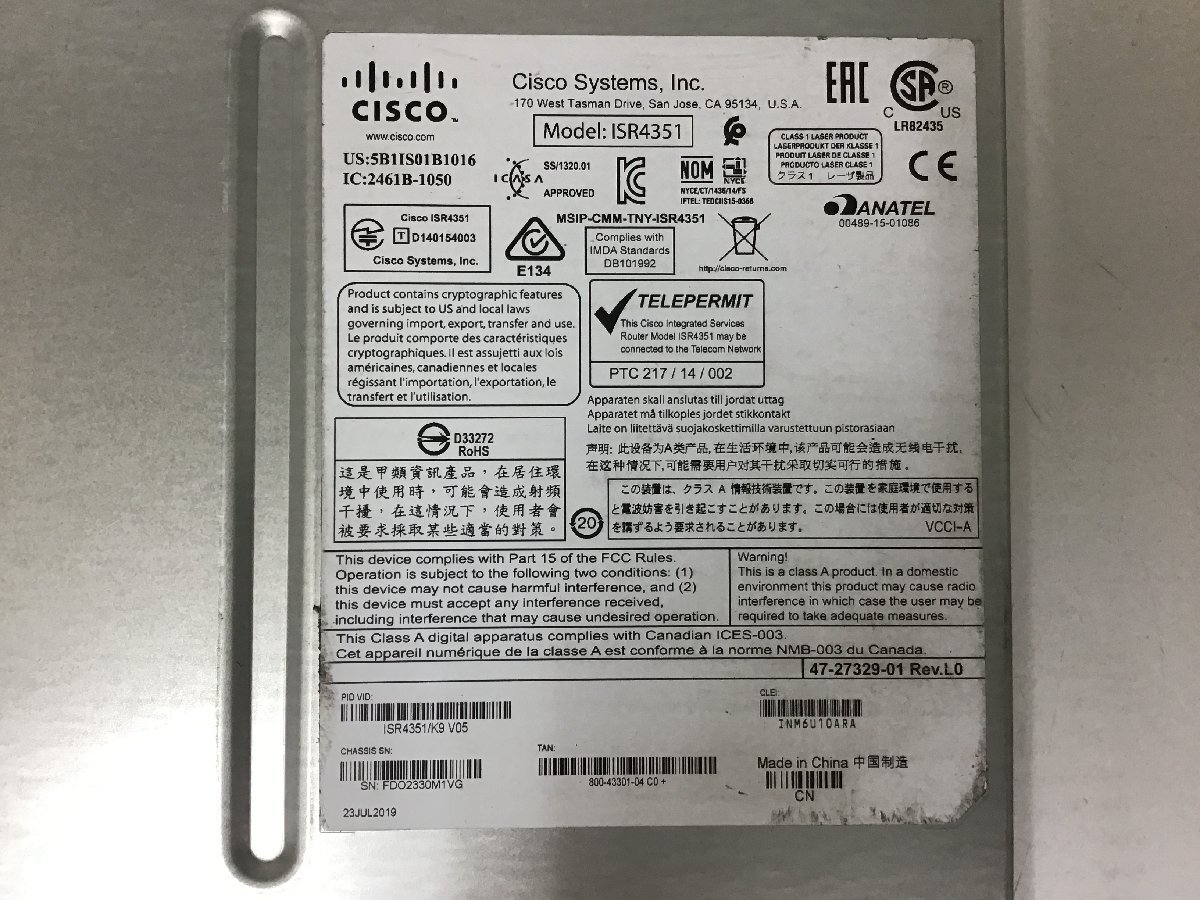 初期化済み CISCO/シスコ Cisco 4000 シリーズ サービス統合ルータ ISR4351/K9 搭載OS Version 17.3.4a【X02135】