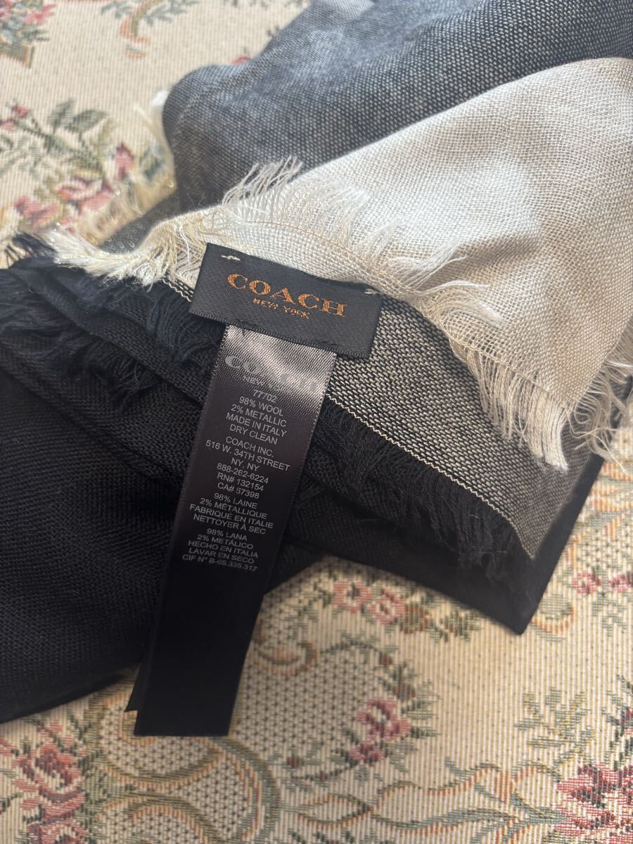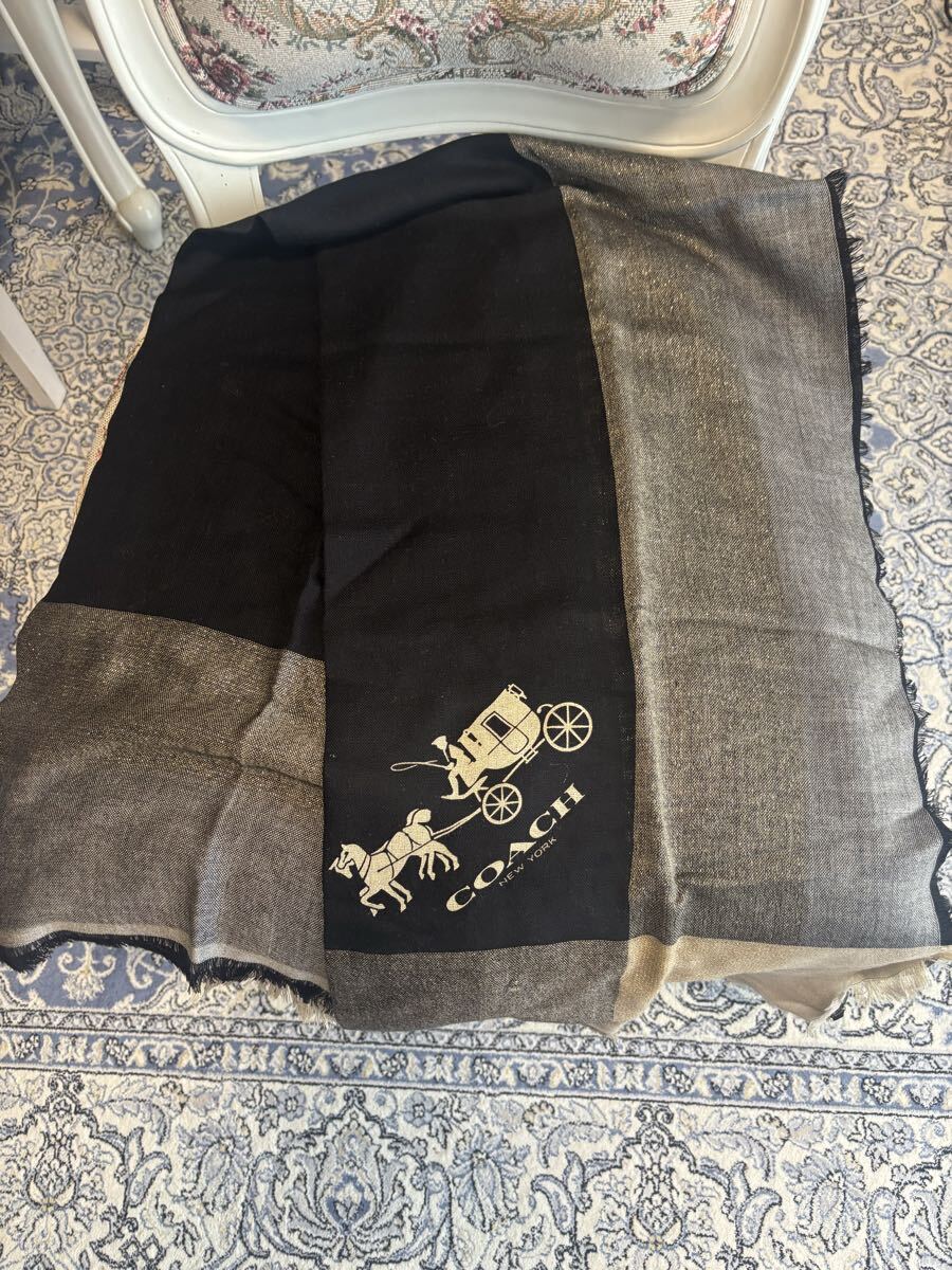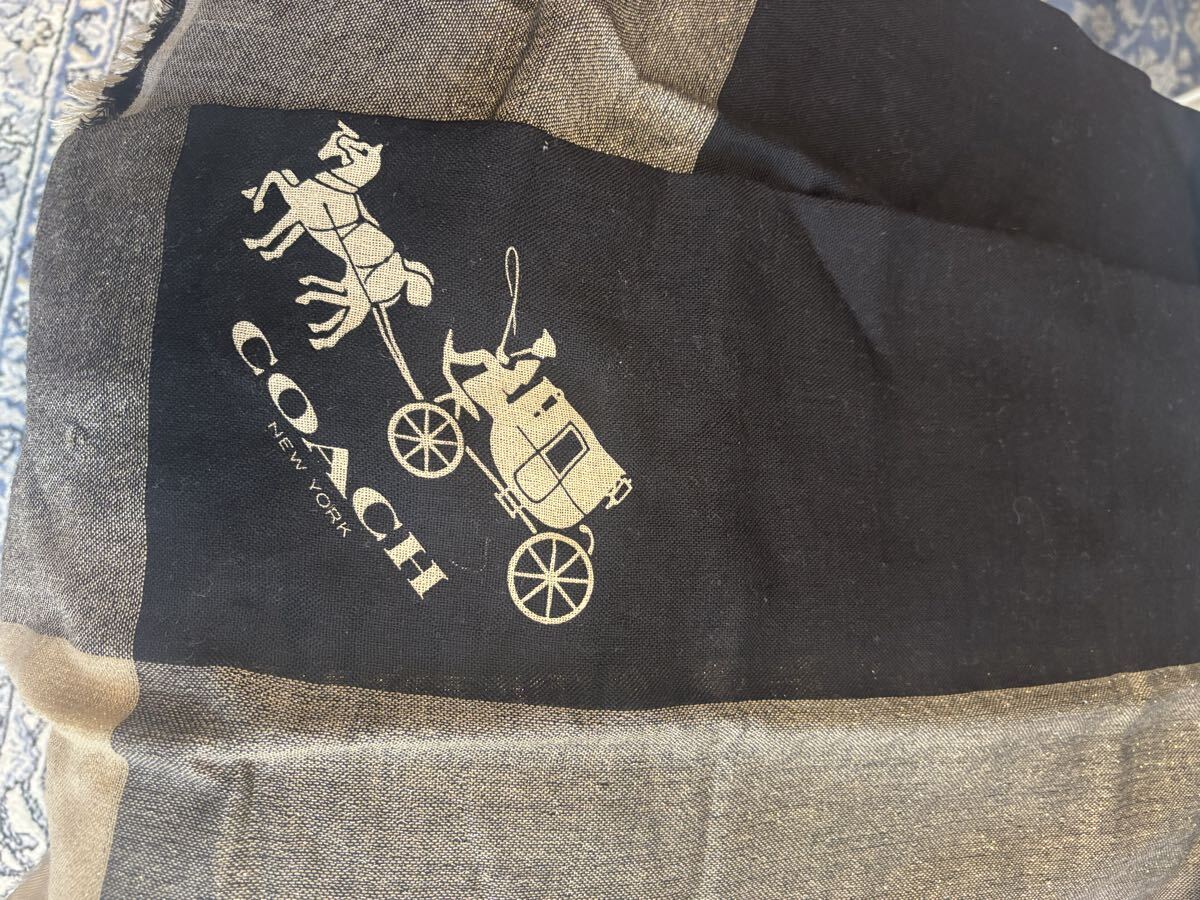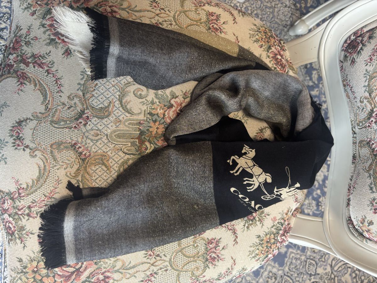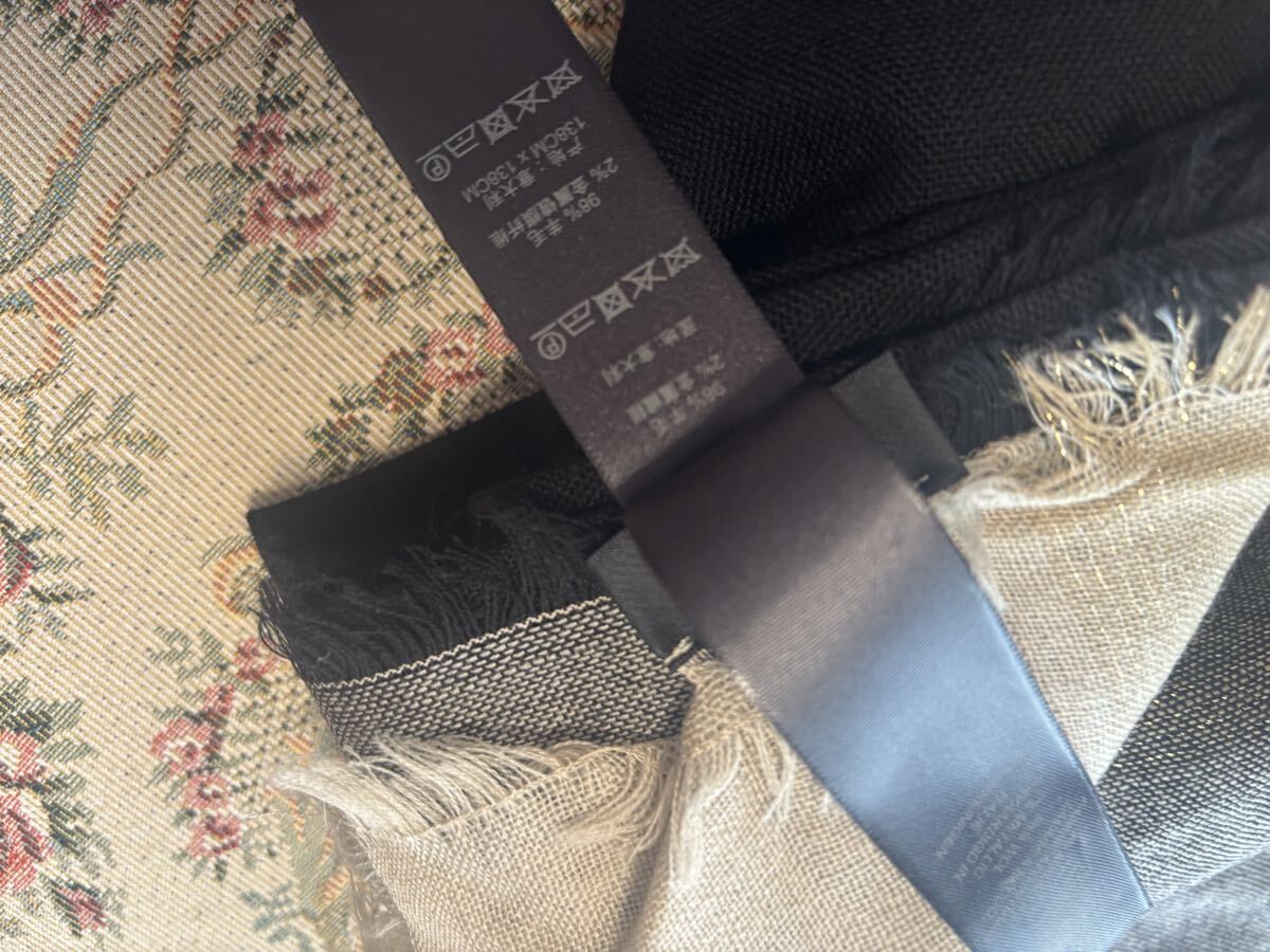 ブラックとグレーのグラデーションに馬車のロゴが特徴のストール。