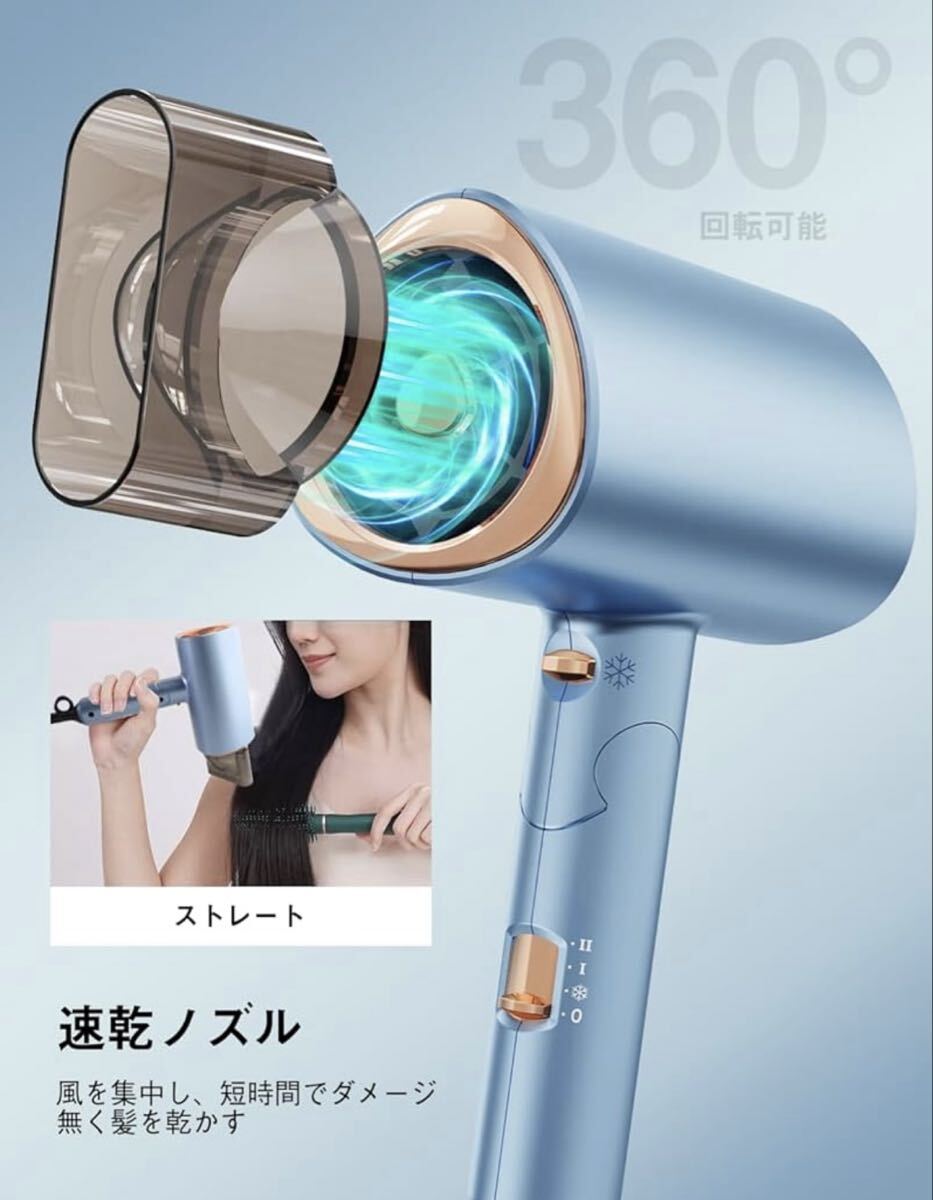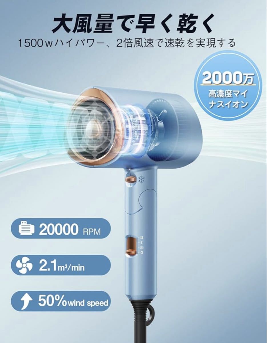 ドライヤー 大風量【2025年春夏限定 美容師監修】速乾 ヘアドライヤー 2000万 マイナスイオン 静電気抑制 57℃恒温 3段階調整 過熱防止 コンパクト 折り畳み 収納ホルダー付属 速乾ノズル ヘアサロン 旅行 ブルー