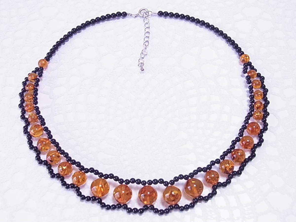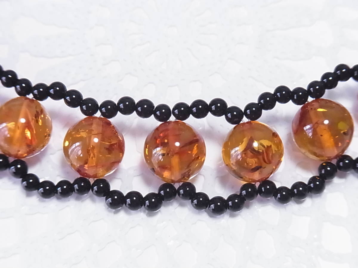 【数量限定販売になります】 琥珀は、模造品や再生琥珀等の天然琥珀ではない琥珀が多く出回っていますが、鑑別機関の最高峰 「中央宝石研究所」 で鑑別をして、間違いない商品を供給してくれる、信用できるサプライヤーから仕入れをしています。 近年、産出量が激減し、値段が高騰しております。また産出国の輸出規制等によって、日本への輸入量も激減しています。 使用石 : 天然琥珀 約10mm 8mm 6mm 天然琥珀特有のグリッターには、個体差があります。 天然ブラック・カルセドニー(染色処理) 約4mm 3mm 長さ : 約40+5cm 重さ : 約17g 留め金 : 引き輪式 アジャスター約5cm 真鍮製(ロジウム・コーティング) 画像はサンプル画像ですが、サンプル画像と遜色のない商品をお送りします。 | ||||