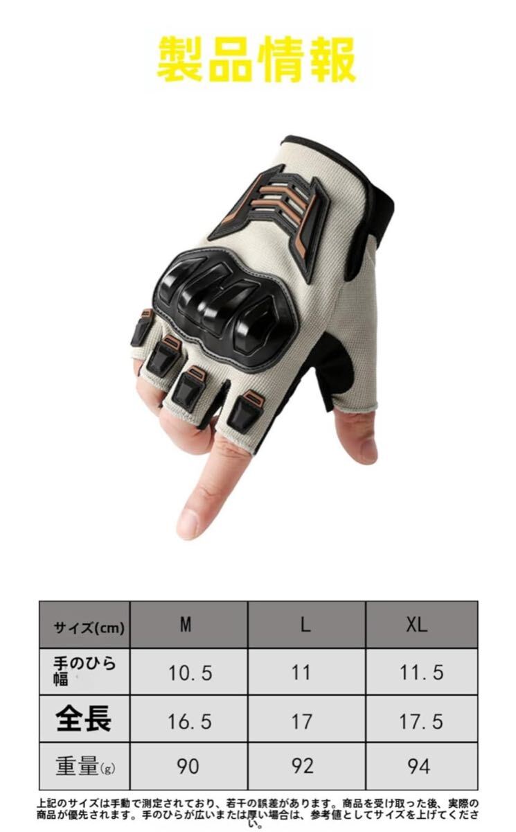 ・指の関節部分には高強度の保護層があり、衝撃に効果的に抵抗し、転倒時の怪我のリスクを軽減し、手を全面的に保護します。