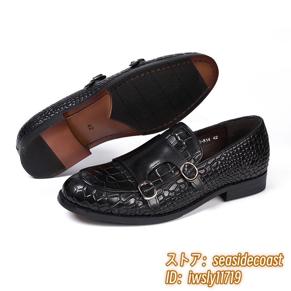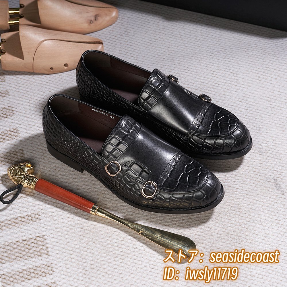 超美品■定価9万 ビジネスシューズ メンズ 鰐柄 本革レザーシューズ 牛革 職人手作り 彫り モンクストラップ 紳士靴 革靴 ブラック 26.0cm