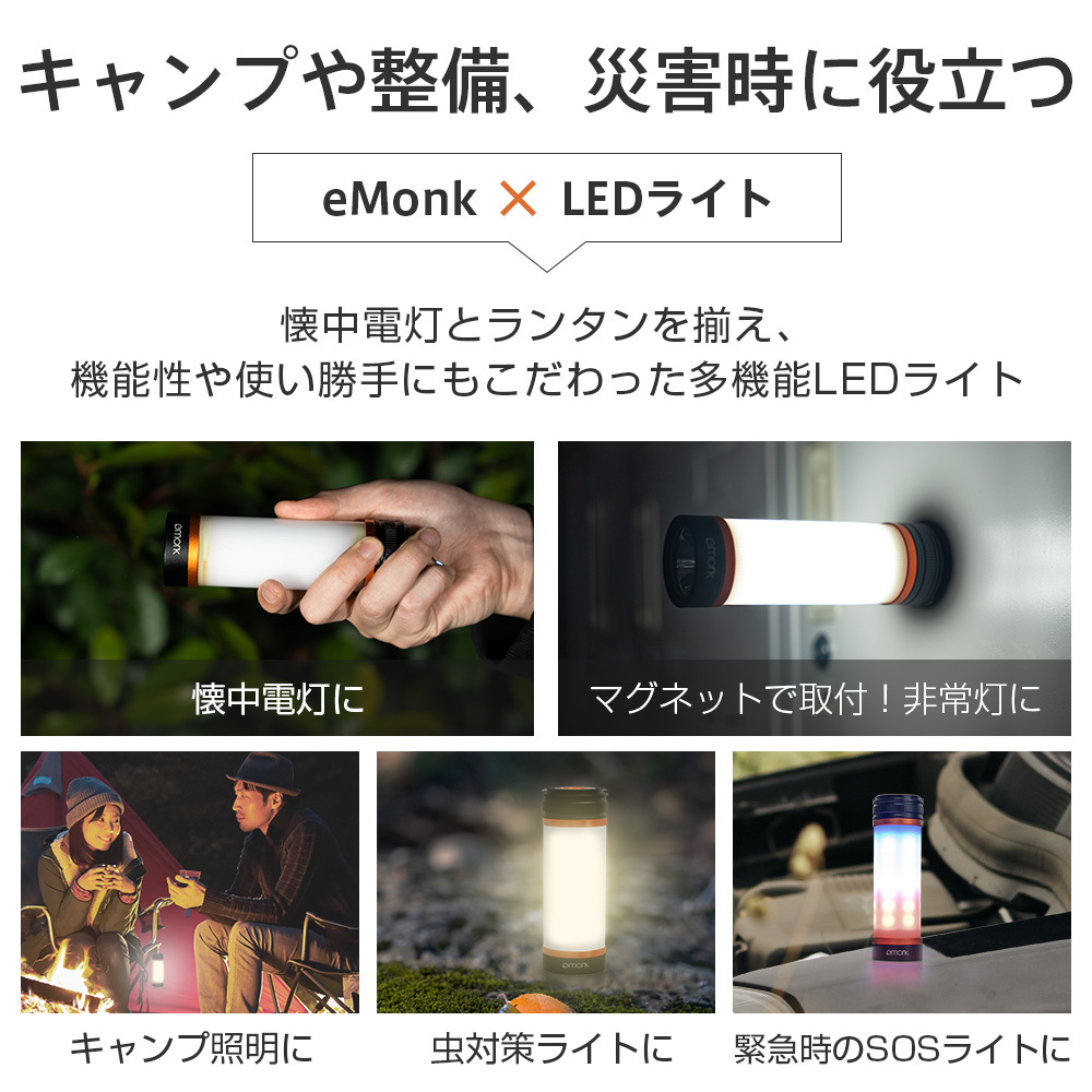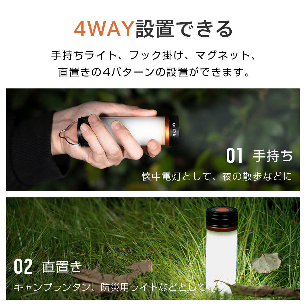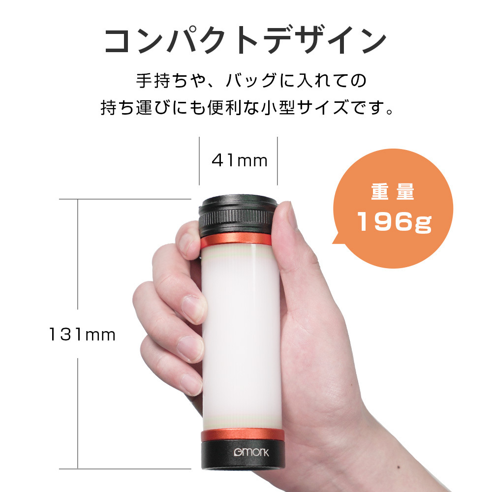 各モード 動作時間 | 先端フラッシュライト:約8時間 高速点滅モード:約12時間 ランタン点灯:約6時間(最大輝度) 約60時間(最小輝度) 虫対策モード:約4時間(最大輝度) 約36時間(最小輝度) SOSモード:約6時間 |