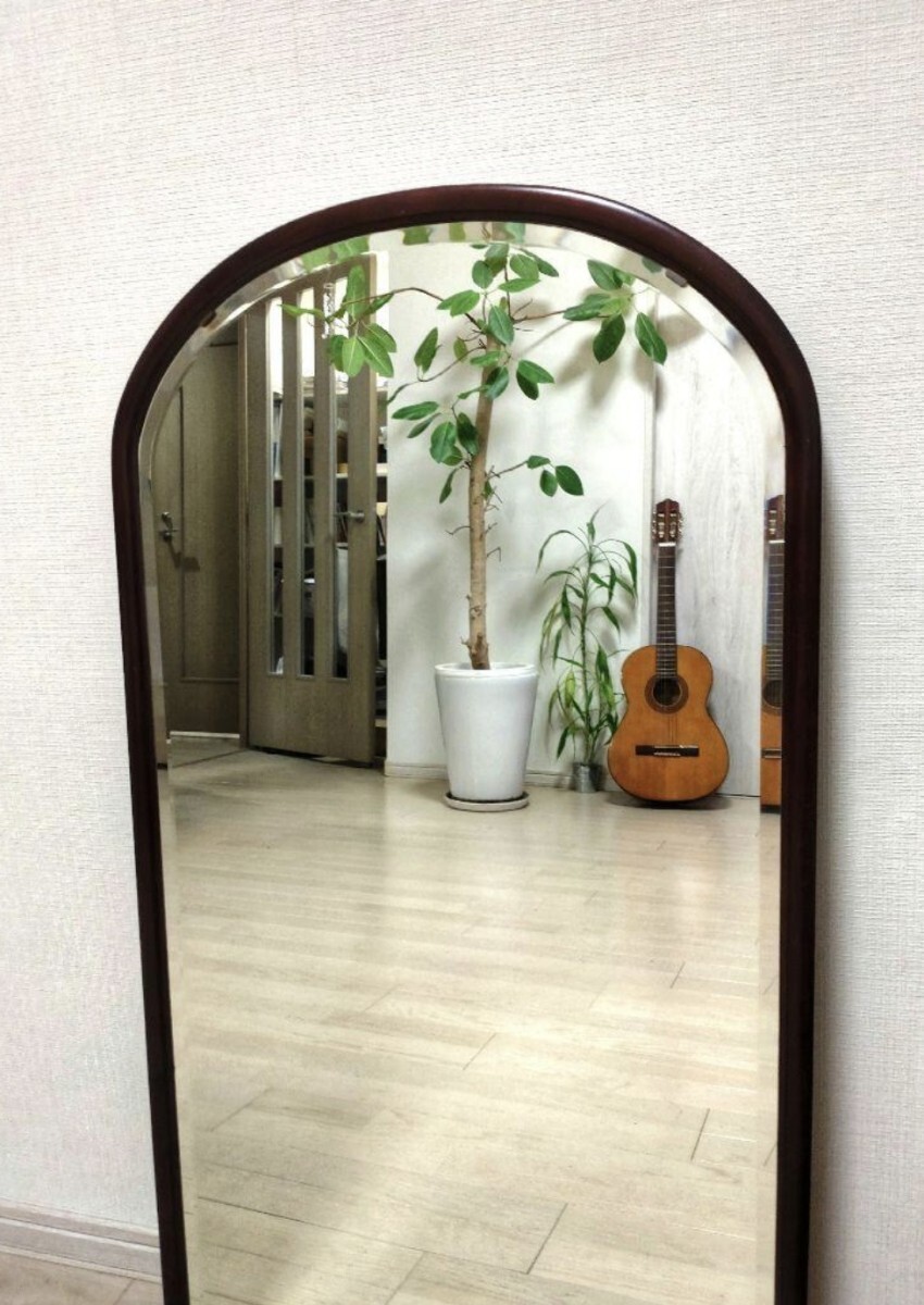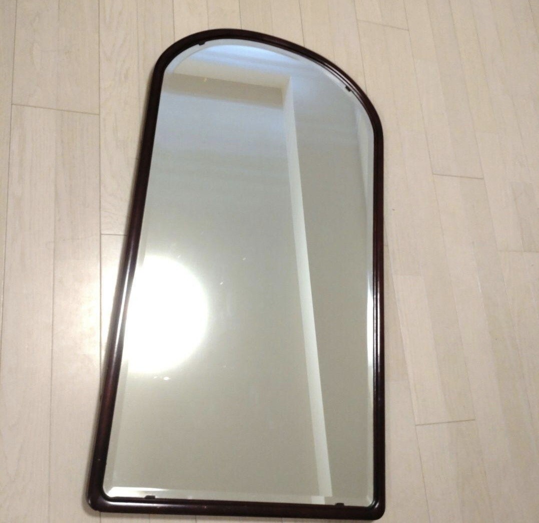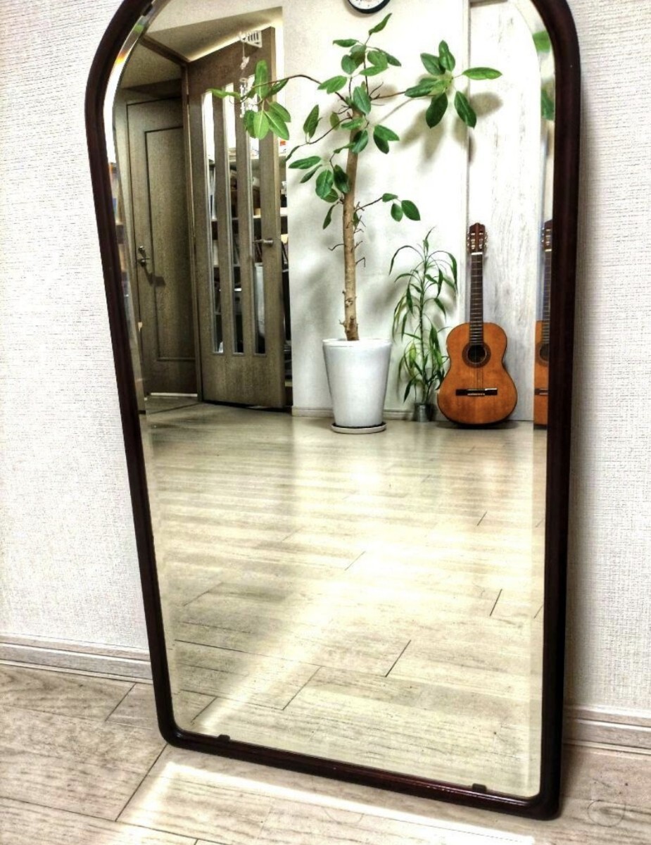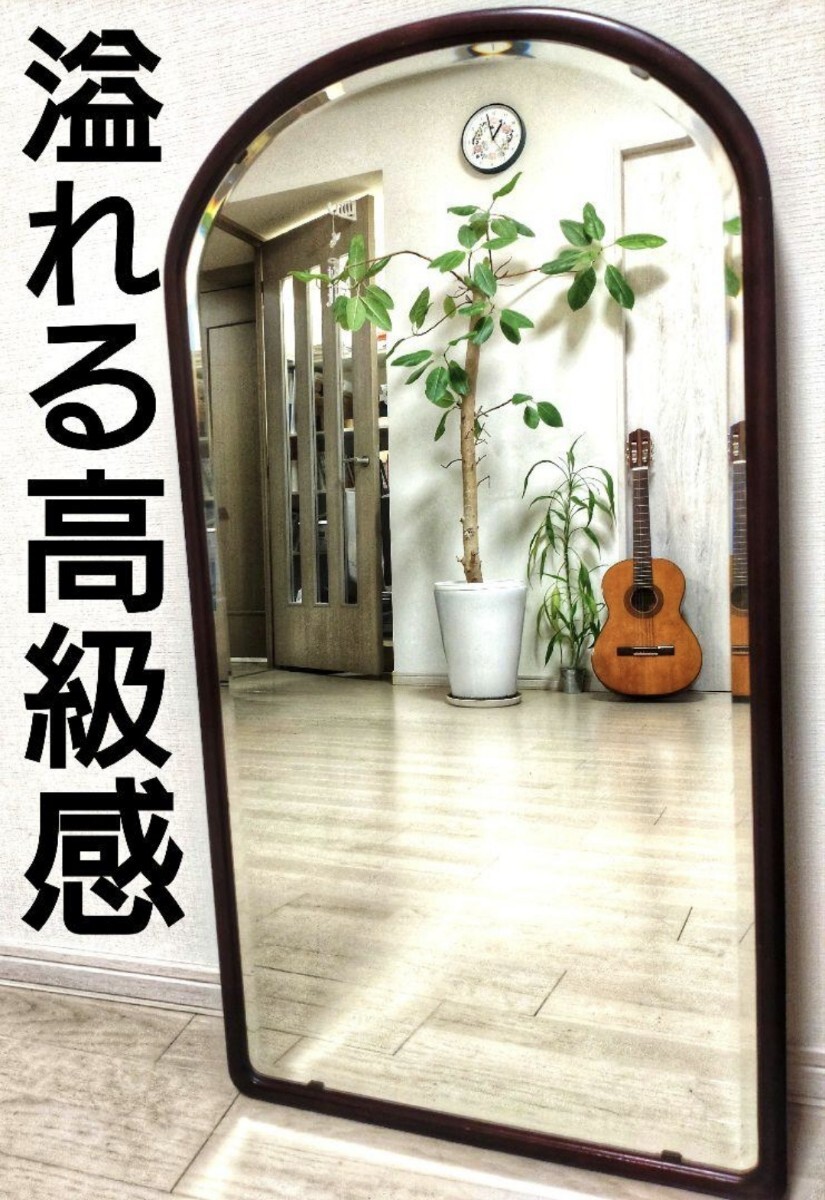 アーチ型のダークブラウンスタンドミラー、高級感があり、インテリアに最適。