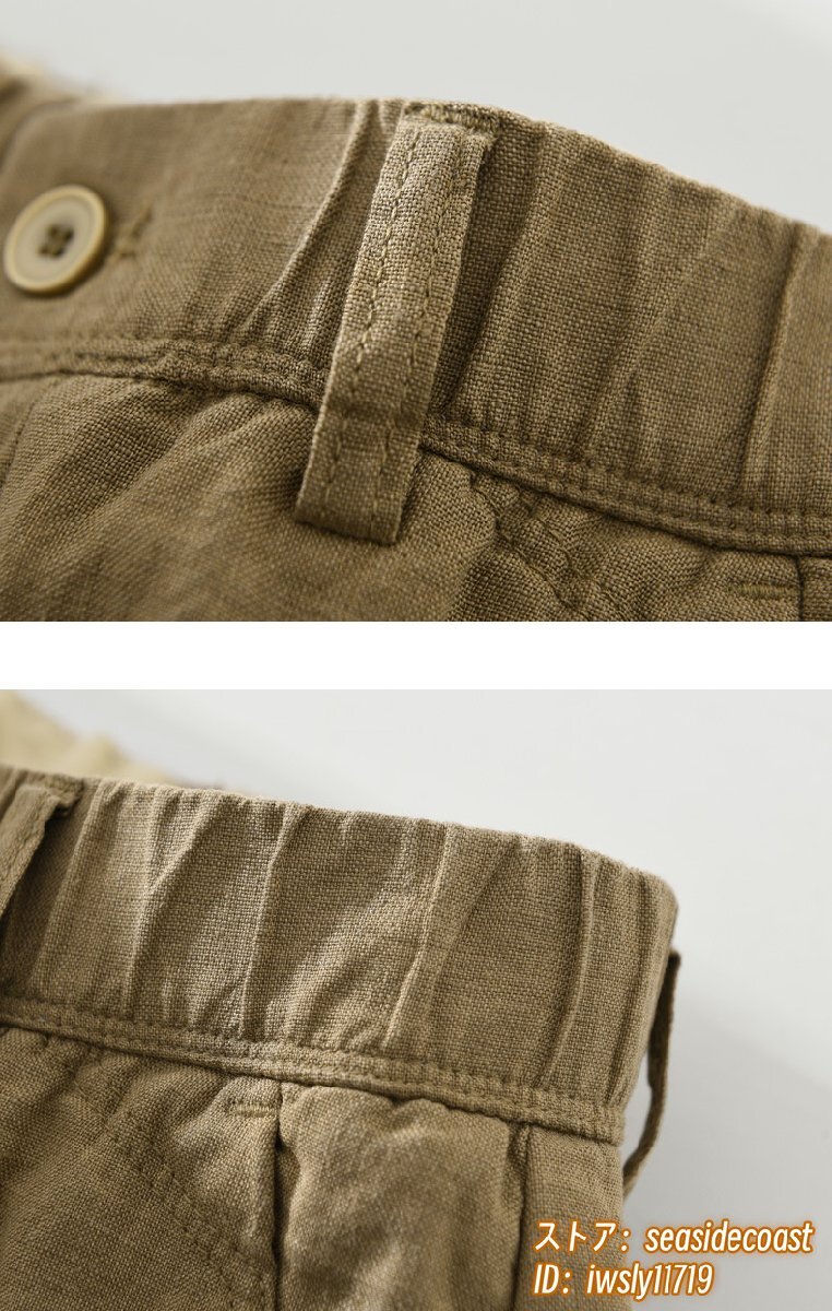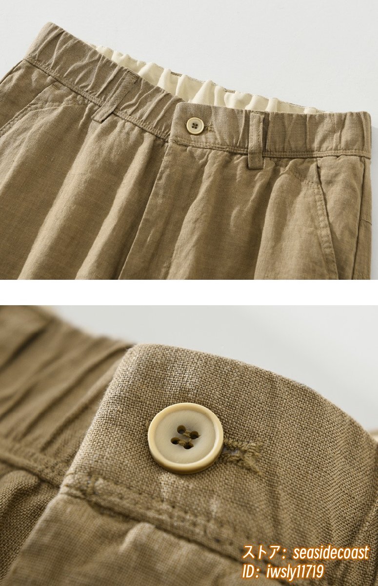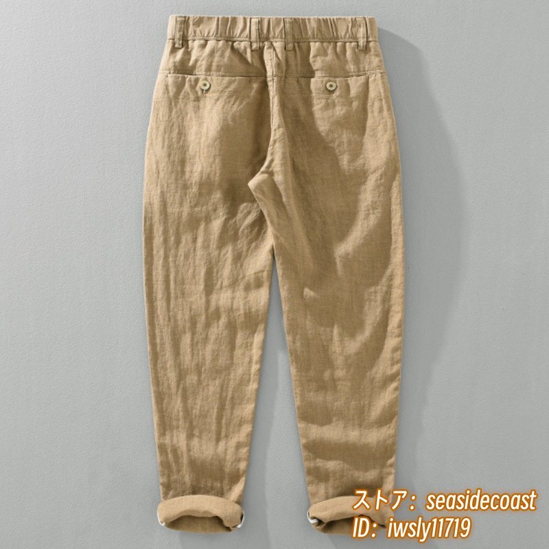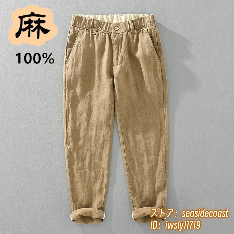 最高級 リネンパンツ 九分丈 麻100% 無地 通気性 スラックス ロングパンツ 清涼感 薄手 イージーパンツ チノパン 春夏 新品 カーキ 2XL