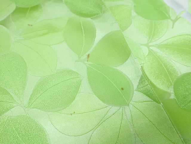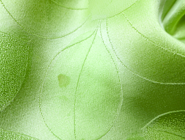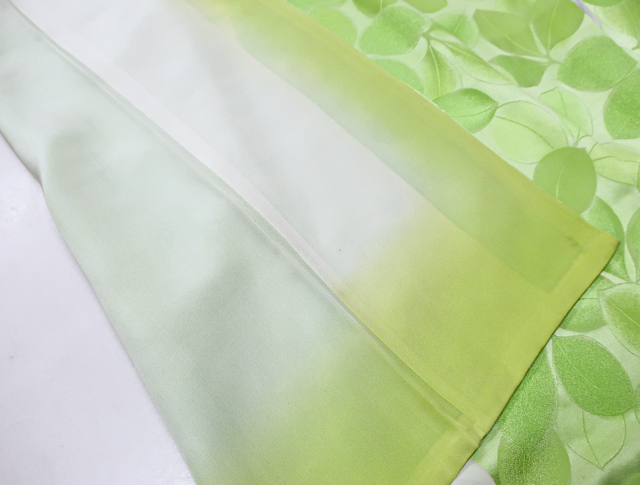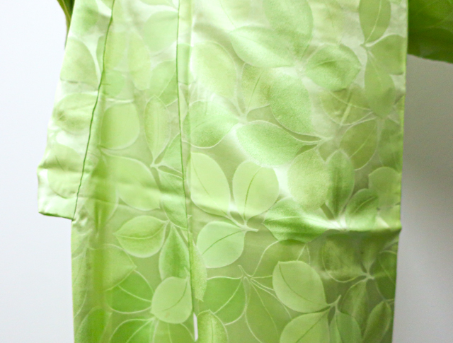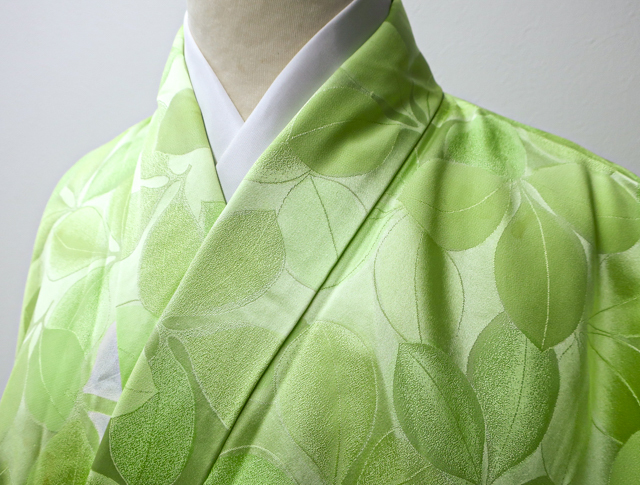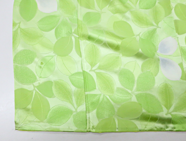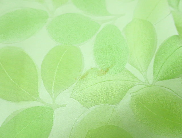 リサイクル商品のため、衿折れ山に汚れ、右袖裏に薄汚れがございます。 また、左右身頃の所々や左衽にシミがございますが着用可能なお品です。 地色は、黄緑色です。 1枚目の画像が近いお色かと思われます。 素材は正絹です。 |