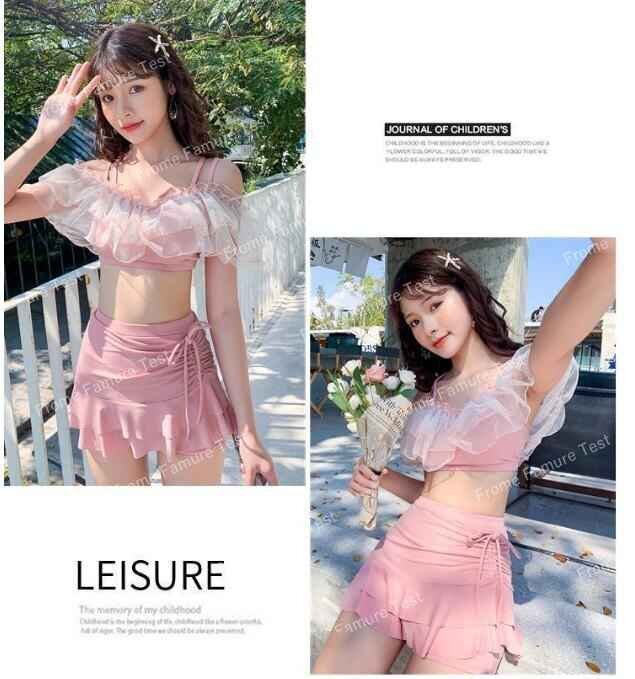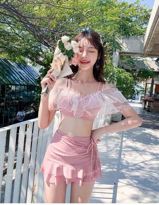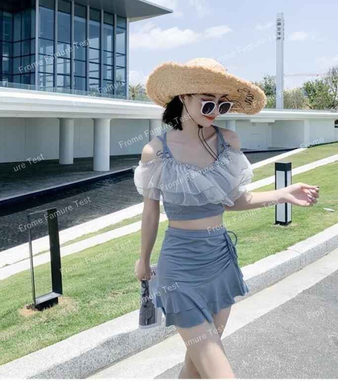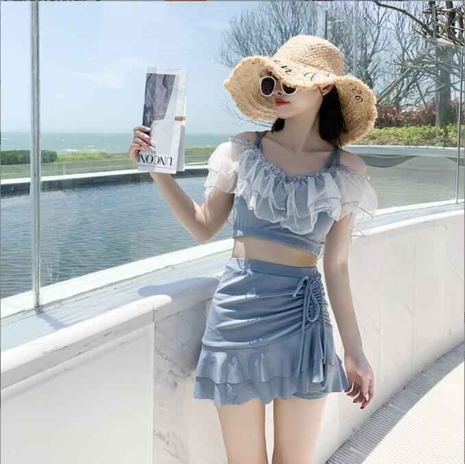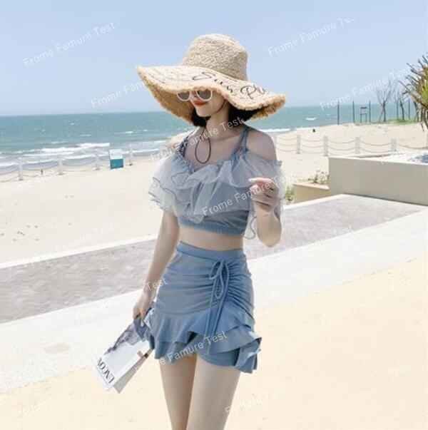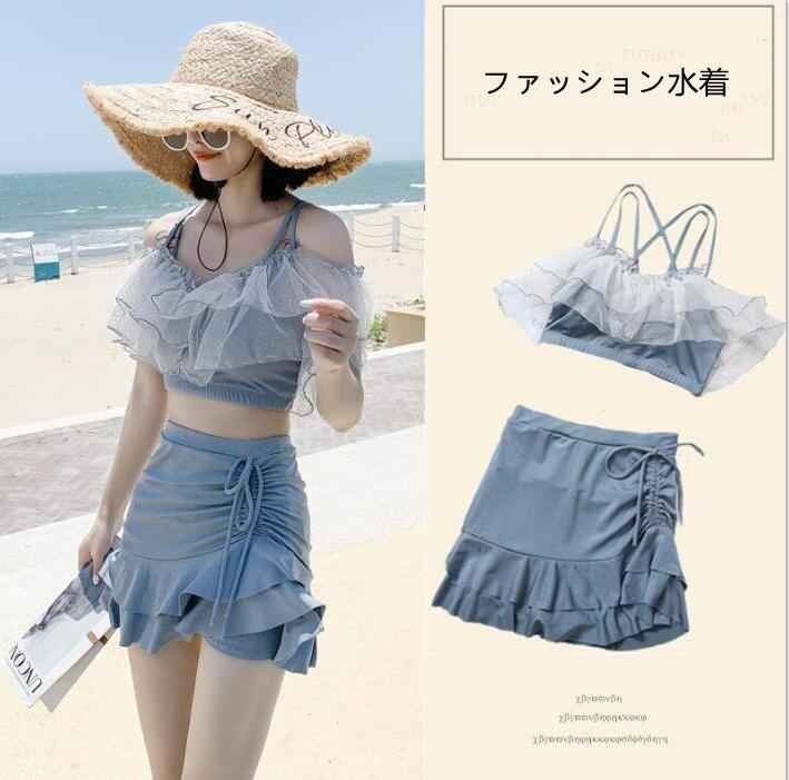 レディース 体型カバー 水着 2点セット スカート水着 フリル ビキニ スイムウェア M ブルー