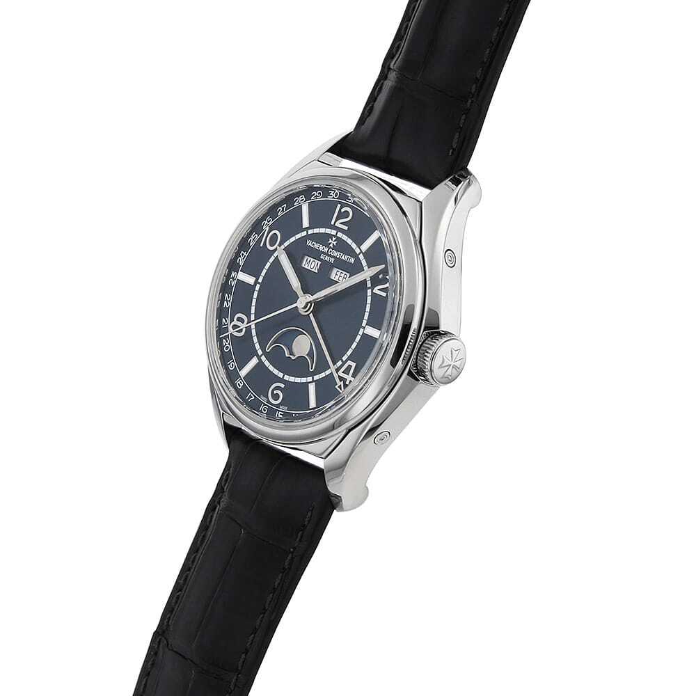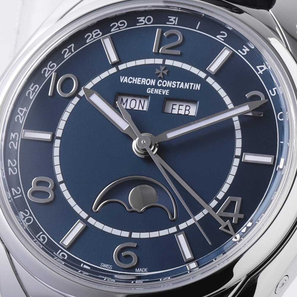 モデル情報 | 1956年に発表されたヴァシュロンコンスタンタンの名機「Ref.6073」に着想を得て、新しくデザインされた「フィフティーシックス」のステンレスモデルが入荷致しました。ラウンドケースにマルタ十字の4枝をアレンジしたラグが特徴的な人気モデルに、ブルー文字盤をあしらったこちらのモデルは、月、曜日、日のトリプルカレンダーにムーンフェイズ機能が搭載されており実用的にも長けております。 |