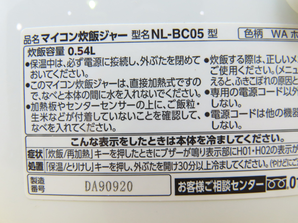 象印・マイコン炊飯ジャー・2019年製・NL-BC05・3合炊き・中古品・152203