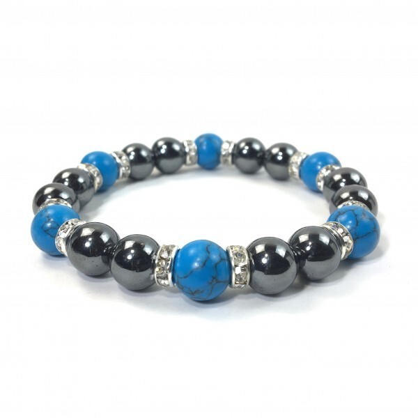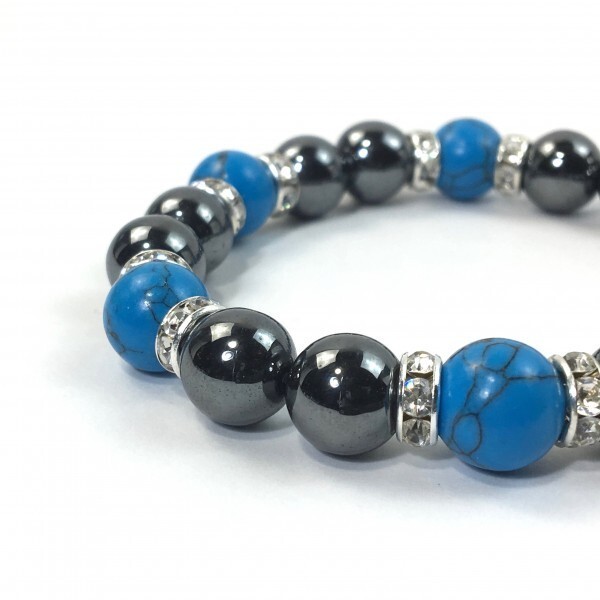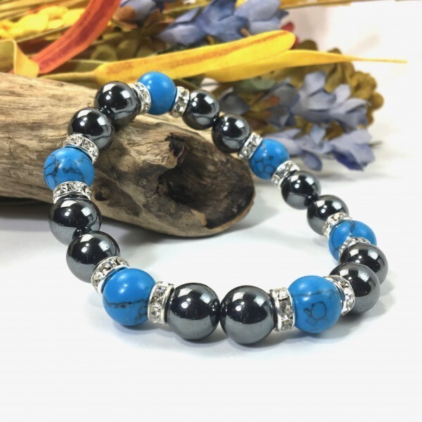 こちらは、ヘマタイトとターコイズを組み合わせたブレスレットです。間にはロンデルを挟み高級感あるデザインに仕上がっています。石大きさは腕にも馴染みやすいように10mm玉で内径約17cm(伸可能)です。数に限りがございますので気になる方はお早めにどうぞ。サイズ調節も可能ですのでサイズ調節の場合は取引ナビにてご一報くださいませ。(サイズ調節無料です)