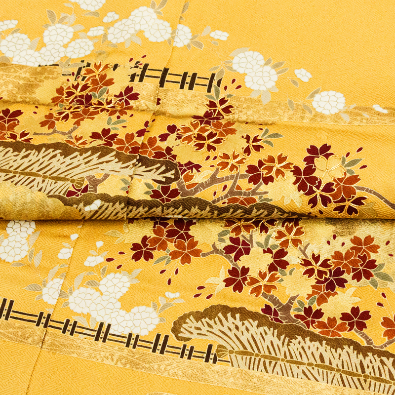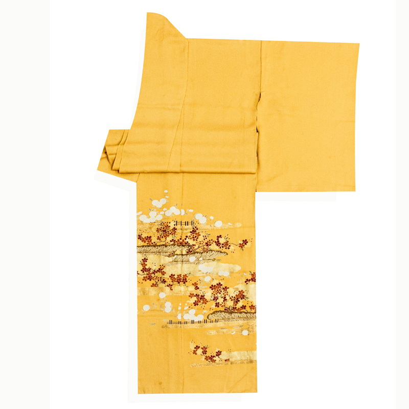 | ★商品説明 | ■京友禅伝統工芸手描き染で、丁寧に菊桜雲取り図をデザインした色留袖です。 ■桃山琳派春秋文を本金加工を使い、格調高く表現された特撰品です。 ■匠の多彩な箔使いで制作された逸品が、高いお席での着姿を応援します。 |