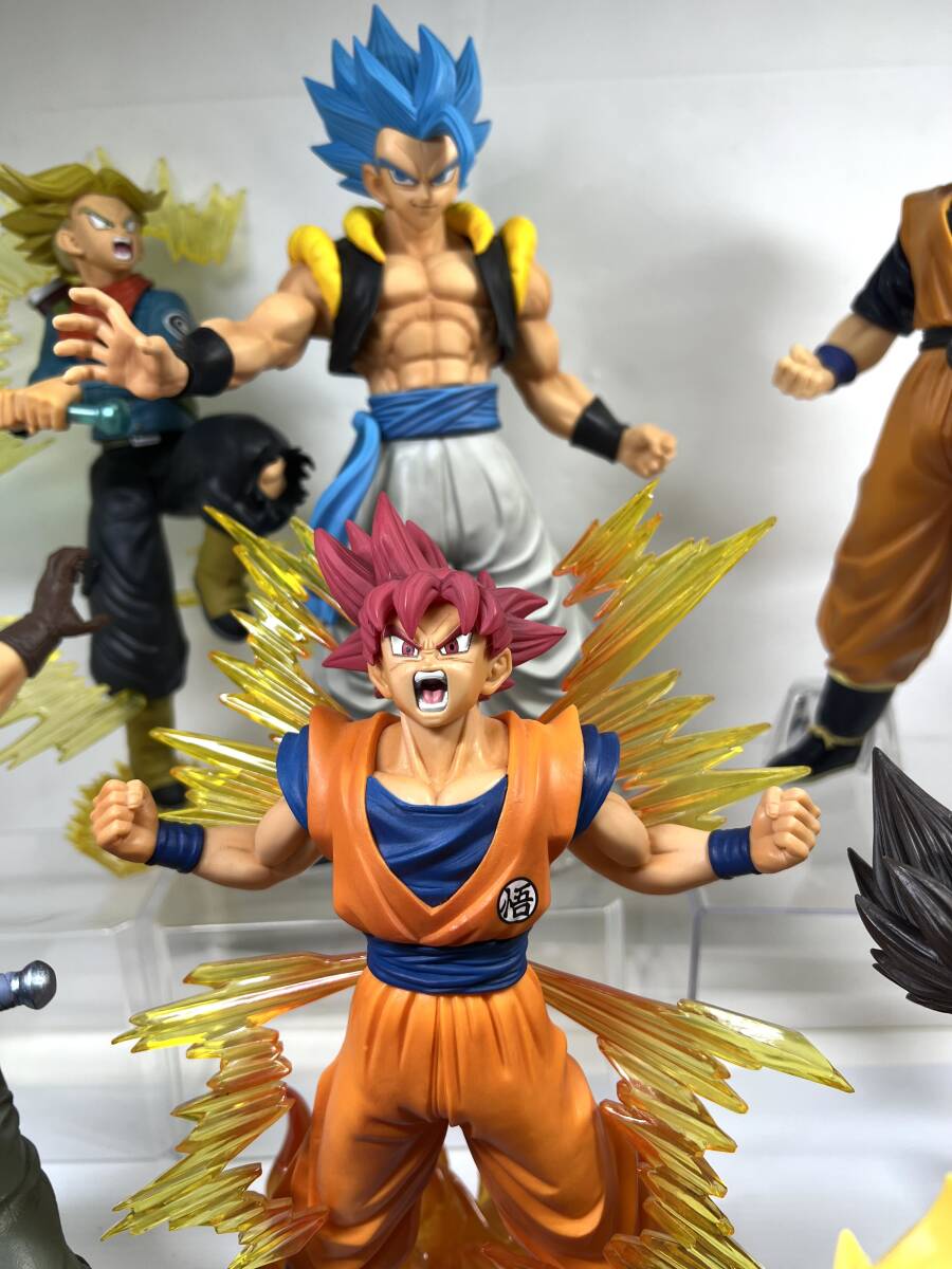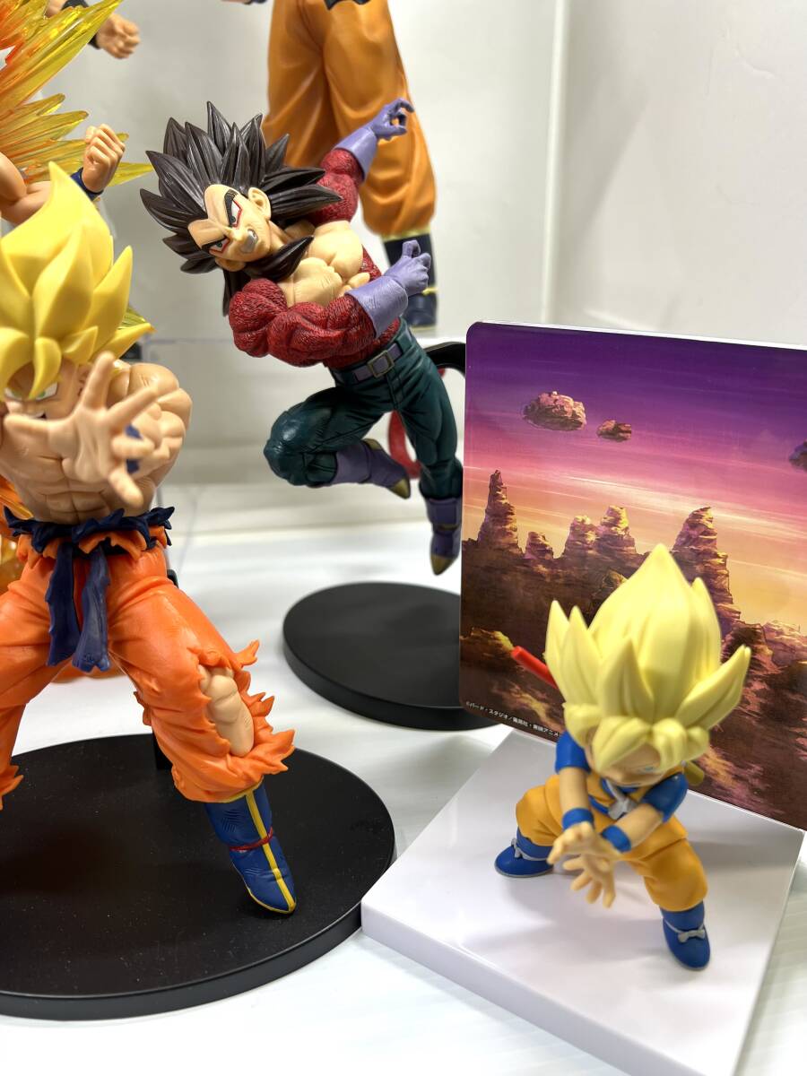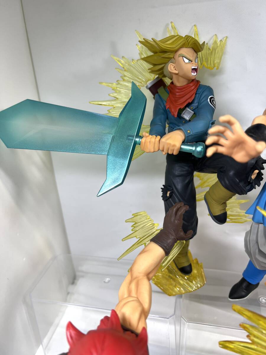 全て箱なしです。掲載画像8枚目、一番くじの未来トランクスですが、一部破損、また支柱がないため自立できません。その他は問題ないと思います。