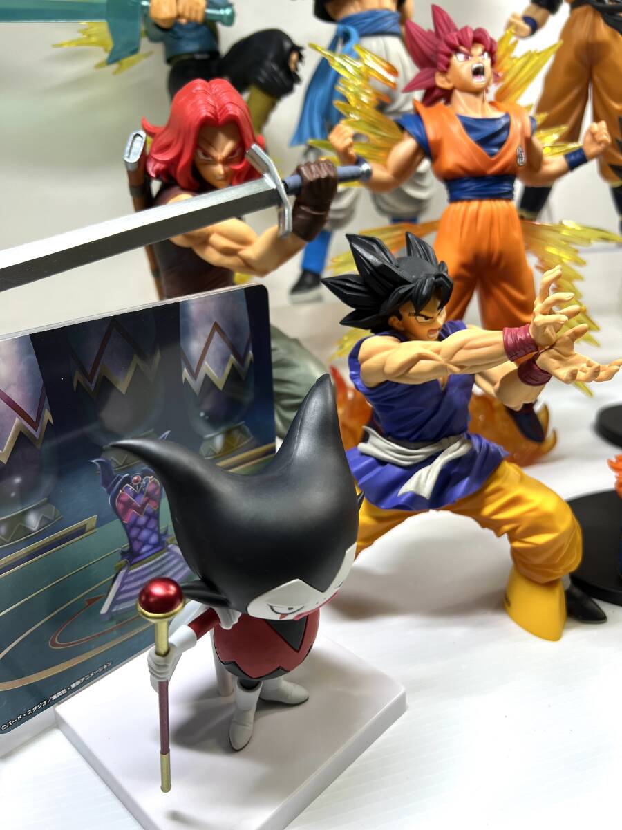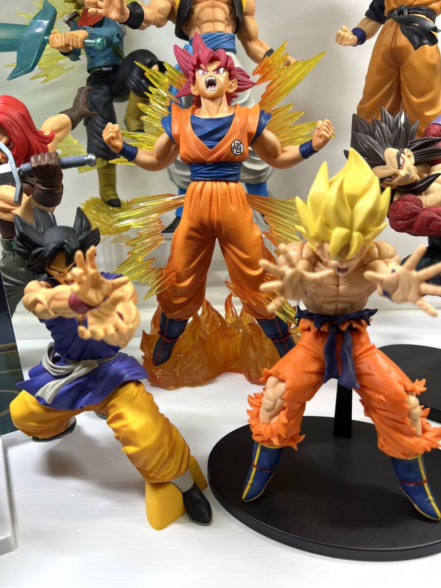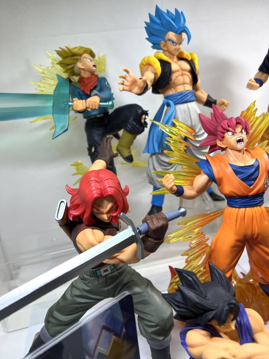 全て箱なしです。掲載画像8枚目、一番くじの未来トランクスですが、一部破損、また支柱がないため自立できません。その他は問題ないと思います。