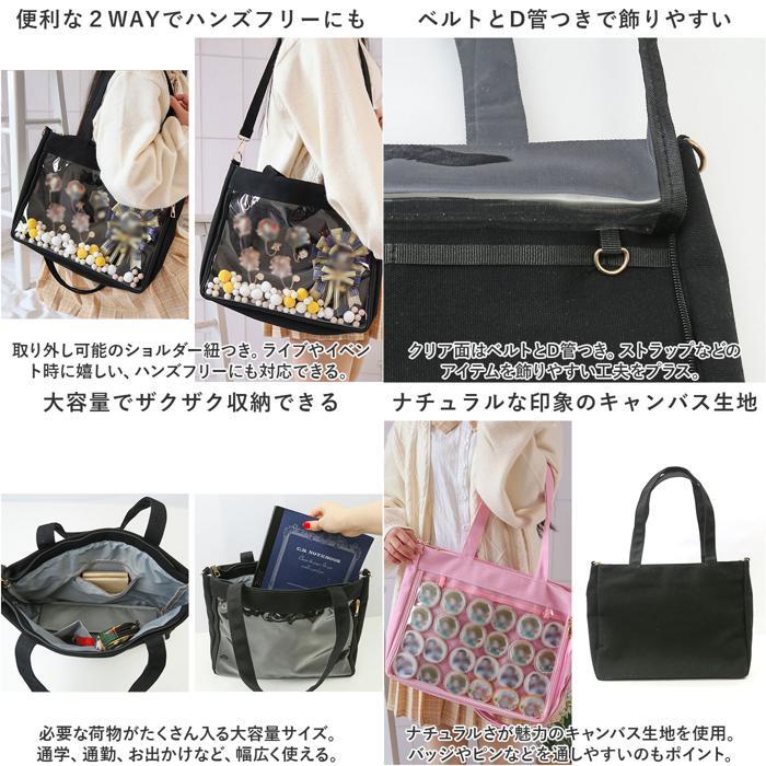 | 商品説明 | ・・便利な2WAY仕様☆推しアイテムをデコレーションできる!「痛バッグ」が登場。 ・【大好きなぬいぐるみやバッジをデコ】 ・大好きな推しグッズを一面にデコレーションできる仕様。自分だけのカスタムバッグが完成☆ ・【大きく開き、なんでも入れやすい☆】 ・コの字ファスナーでガバっと大きく開くデコ面!ぬいぐるみ、アクスタなどなんでも入れやすい。 ・【便利な2WAYでハンズフリーにも】 ・取り外し可能のショルダー紐つき。ライブやイベント時に嬉しい、ハンズフリーにも対応できる。 ・【ベルトとD管つきで飾りやすい】 ・クリア面はベルトとD管つき。ストラップなどのアイテムを飾りやすい工夫をプラス。 ・【大容量でザクザク収納できる】 ・必要な荷物がたくさん入る大容量サイズ。通学、通勤、お出かけなど、幅広く使える。 ・【ナチュラルな印象のキャンバス生地】 ・ナチュラルさが魅力のキャンバス生地を使用。バッジやピンなどを通しやすいのもポイント。 ・【底板つきでたくさん入れても丈夫】 ・底板つきなので、荷物が多くても型崩れしにくく丈夫。長く愛用できる。 ・【選べるカラーバリエーション】 ・元気なカラーからベーシックまで幅広くご用意。推しカラーをチョイスするのもGOOD。 ・【ポケット仕様】 ・メイン収納:オープンポケット×2、ファスナーポケット×1 |