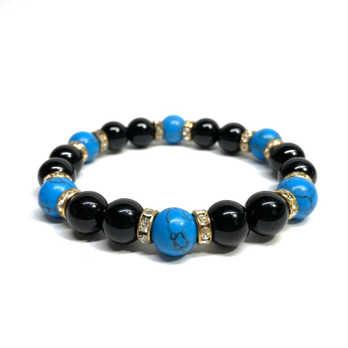 こちらは、モリオンとターコイズを組み合わせたパワーストーンブレスレットです。間にはロンデルを挟み高級感あるデザインに仕上げております。石大きさは腕にも馴染みやすいように10mm玉で内径約18cm(伸可能)です。(サイズ変更の場合は取引ナビにてご連絡をお願いします。) 数に限りがございますので気になる方はお早めにどうぞ。