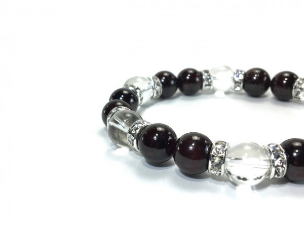 こちらは、ガーネットと水晶を組み合わせたブレスレットです。間にはロンデルを挟み高級感あるデザインに仕上がっています。石大きさは腕にも馴染みやすいように10mm玉で内径約18cm(伸可能)です。数に限りがございますので気になる方はお早めにどうぞ。サイズ調節も可能ですのでサイズ調節の場合は取引ナビにてご一報くださいませ。(サイズ調節無料です)