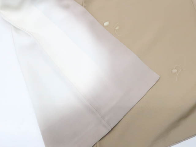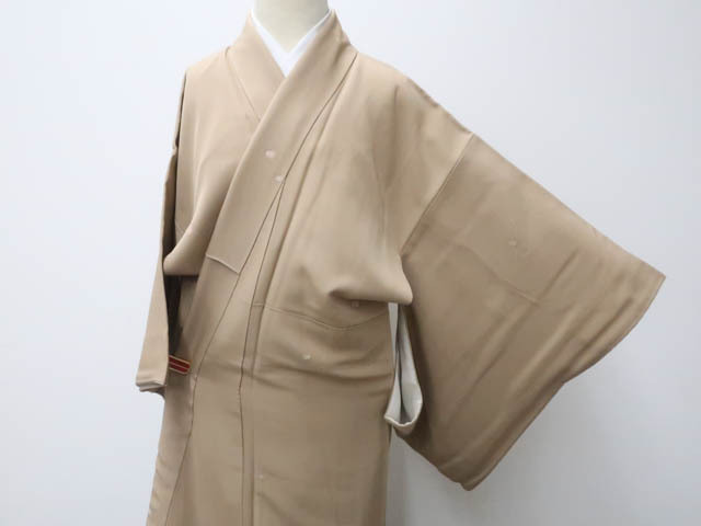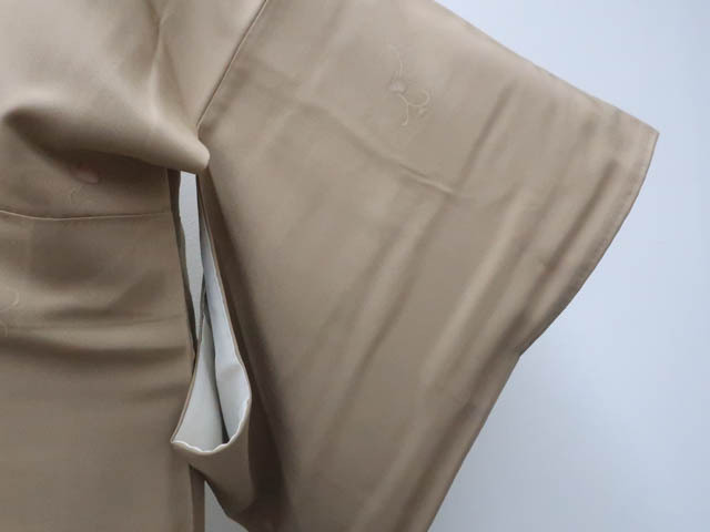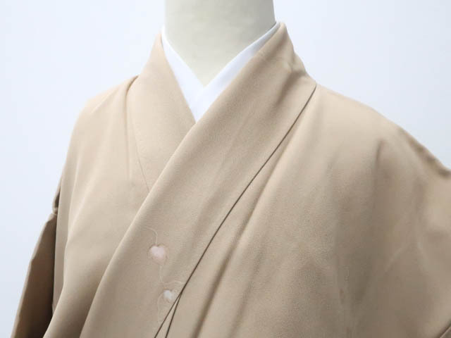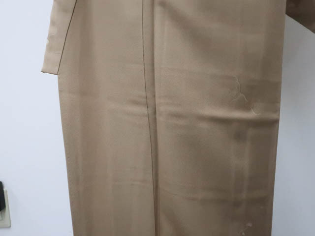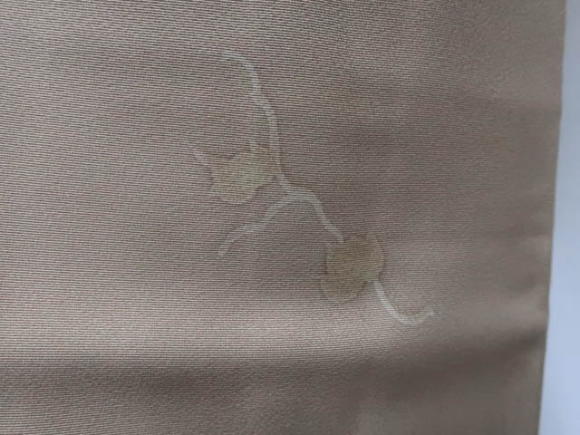 リサイクル商品のため、全体に汚れがございますが着用可能なお品です。 地色は 薄茶です。 1枚目の画像が近いお色かと思われます。 素材は正絹です。 |