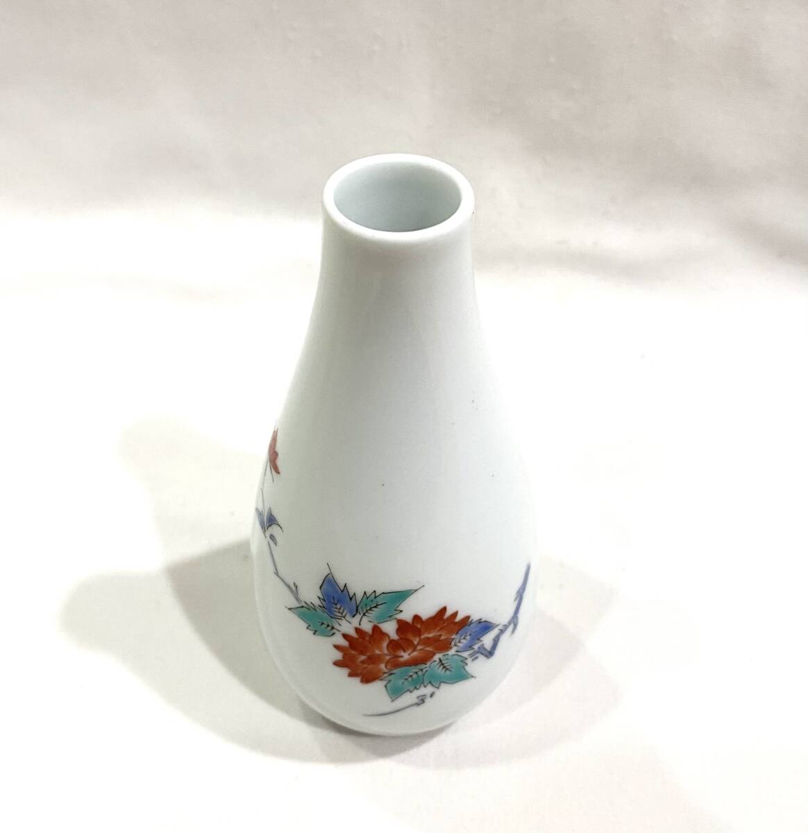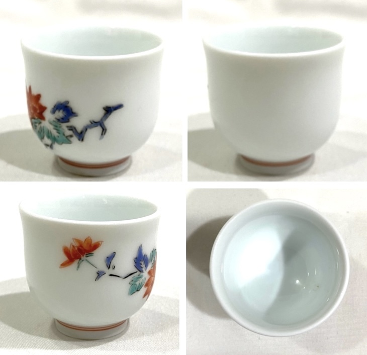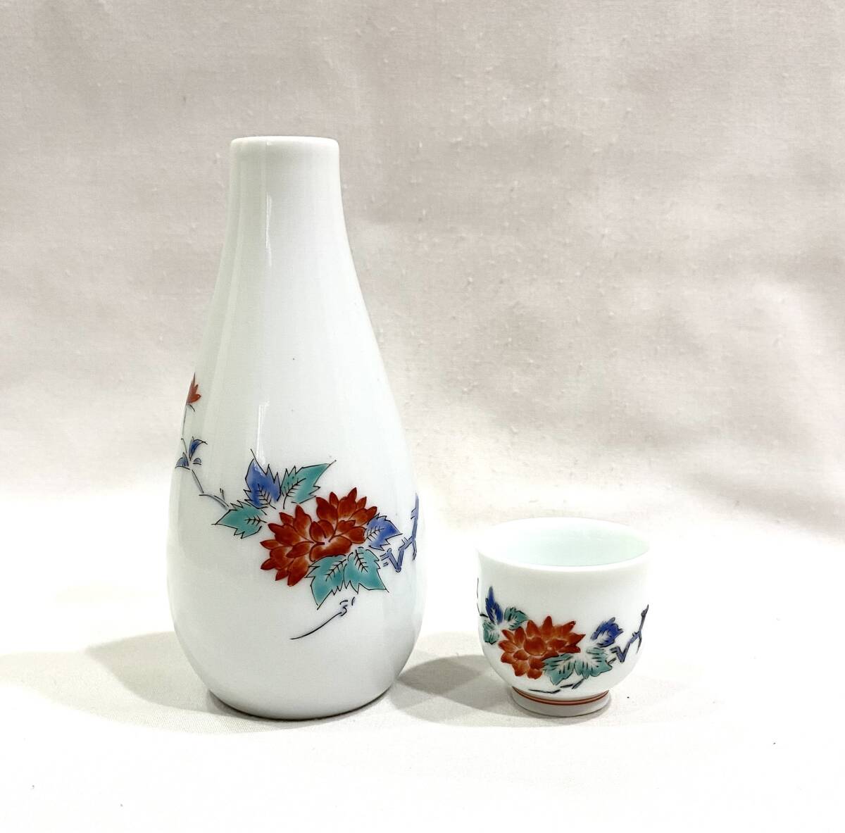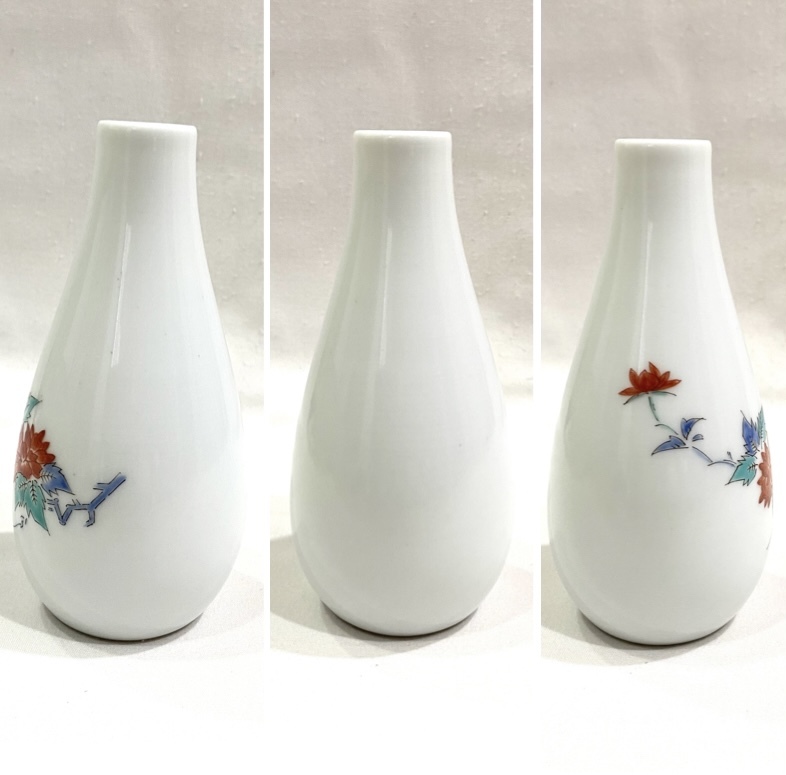 13代 酒井田柿右衛門の色絵 ”錦 花絵酒器”です。純白磁に色絵で花絵が描かれた柿右衛門の徳利と酒盃の酒器で、余白を生かして描かれた花絵の清楚で上品な絵付けに魅力があります。裏面高台内には”柿右衛門”と染付で書かれています。少し古いもので酒杯の高台無釉部分に多少の変色はありますが、欠損などの目立つ傷みはありません。13代 酒井田柿右衛門の色絵 ”錦 花絵酒器”が楽しめます。徳利 口径径2.2㎝、胴径約6.5㎝、高さ約13.0㎝、 酒盃 口外径約4.1㎝、高さ約4.0㎝。