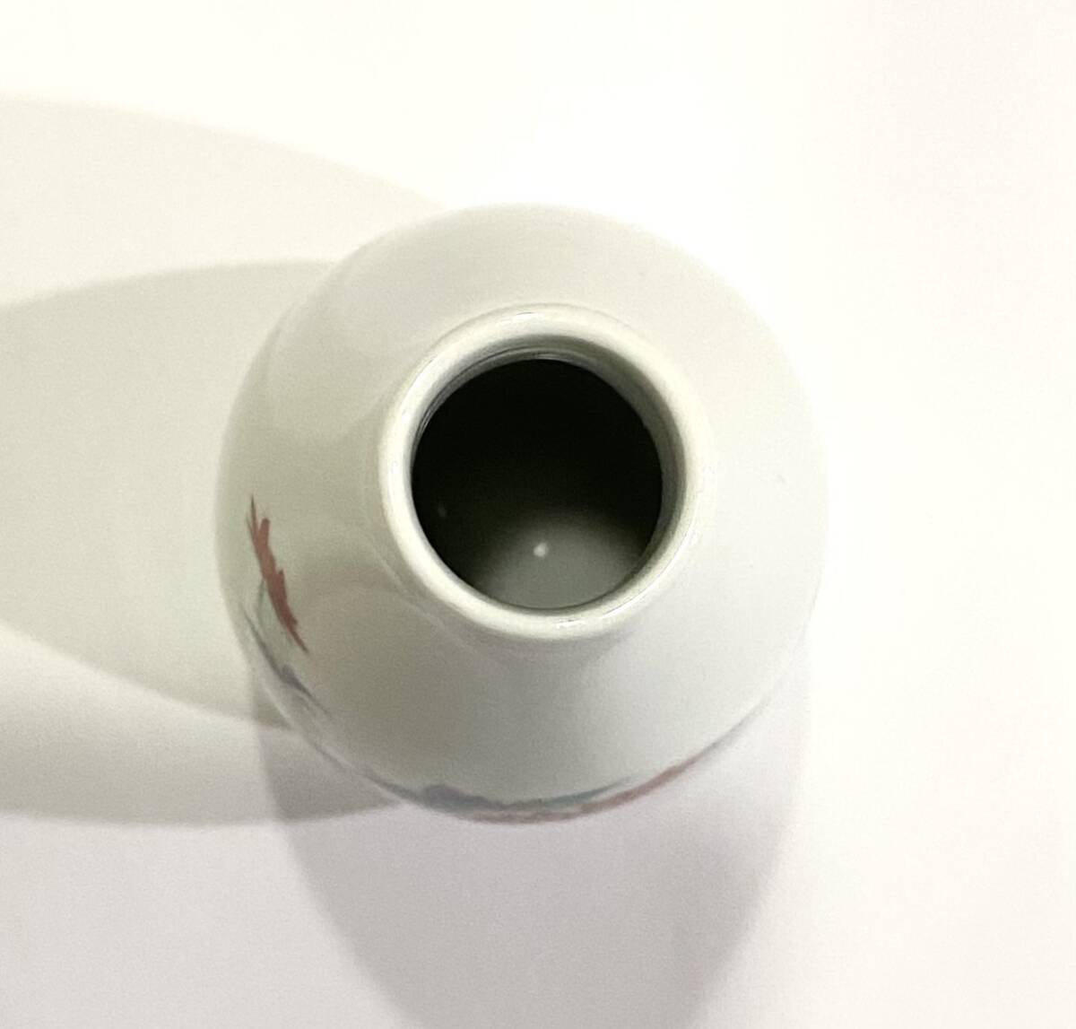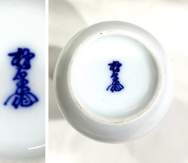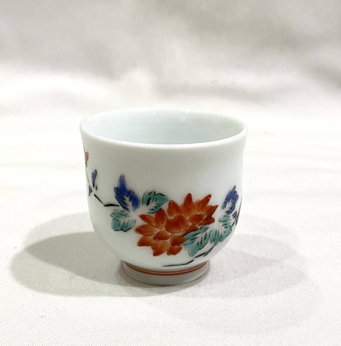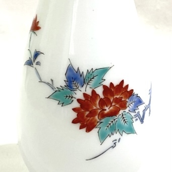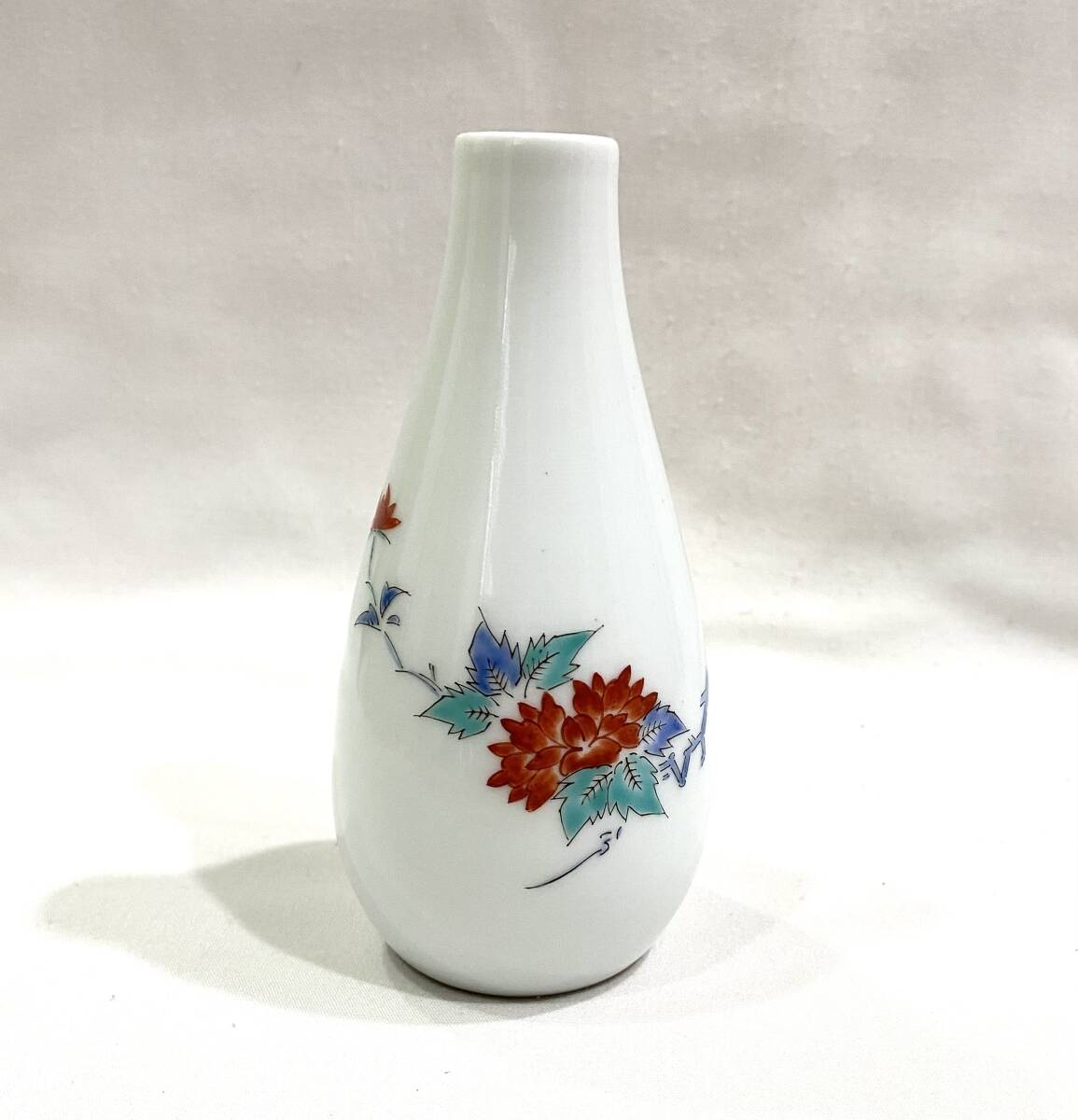 13代 酒井田柿右衛門の色絵 ”錦 花絵酒器”です。純白磁に色絵で花絵が描かれた柿右衛門の徳利と酒盃の酒器で、余白を生かして描かれた花絵の清楚で上品な絵付けに魅力があります。裏面高台内には”柿右衛門”と染付で書かれています。少し古いもので酒杯の高台無釉部分に多少の変色はありますが、欠損などの目立つ傷みはありません。13代 酒井田柿右衛門の色絵 ”錦 花絵酒器”が楽しめます。徳利 口径径2.2㎝、胴径約6.5㎝、高さ約13.0㎝、 酒盃 口外径約4.1㎝、高さ約4.0㎝。