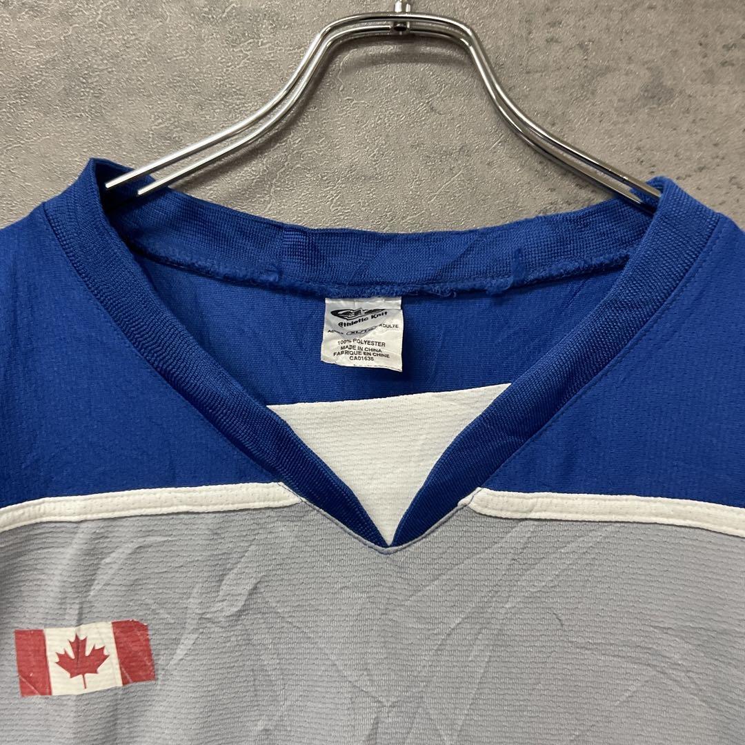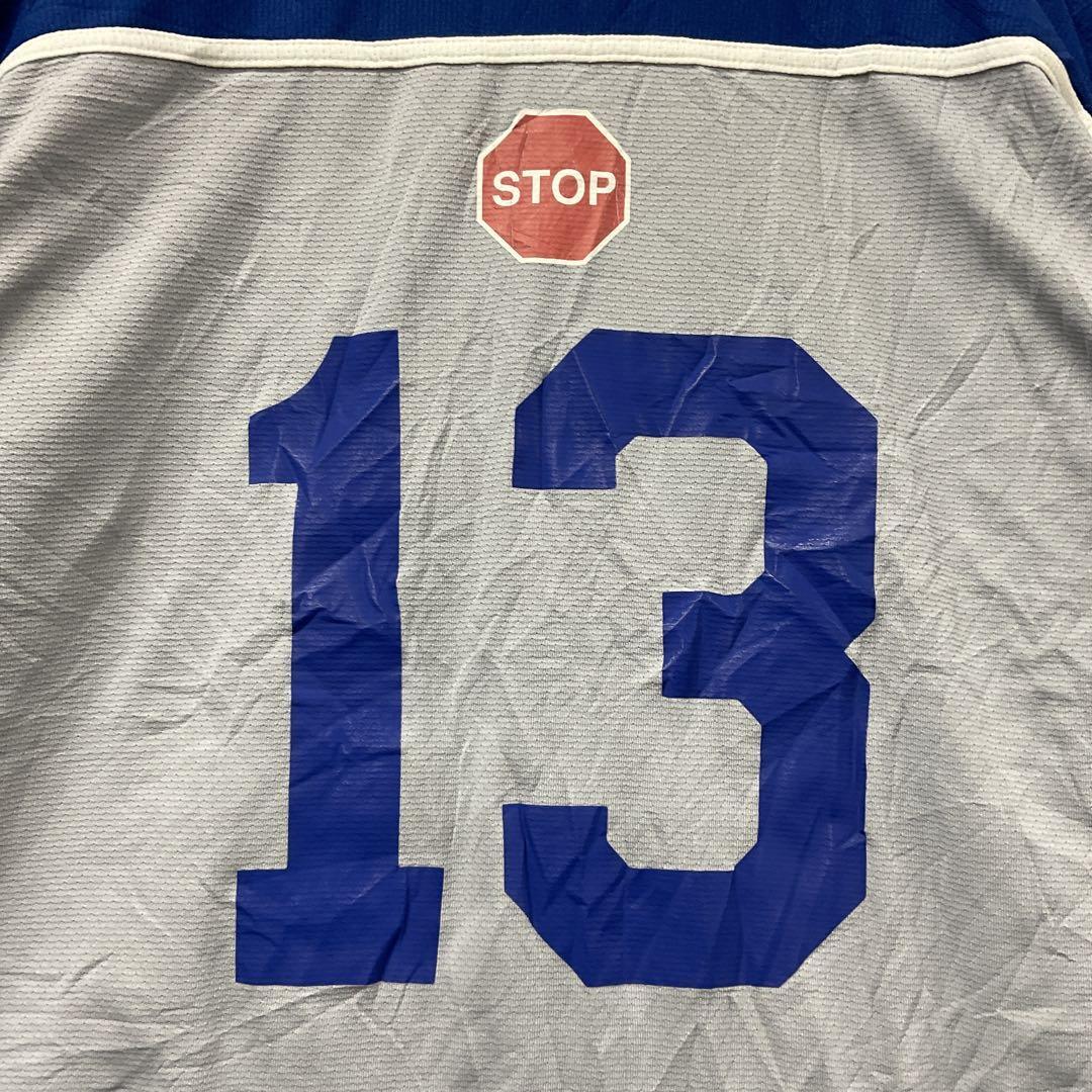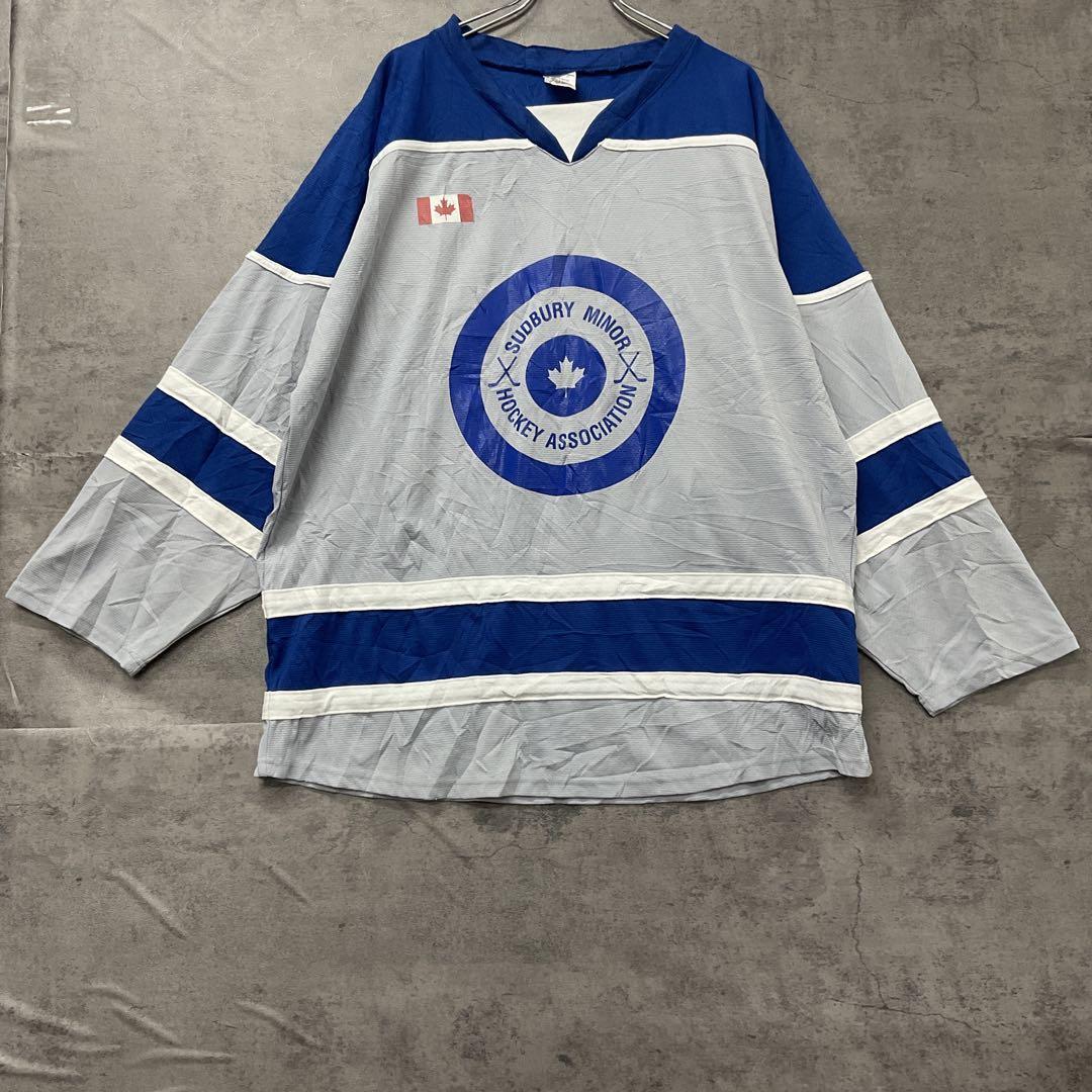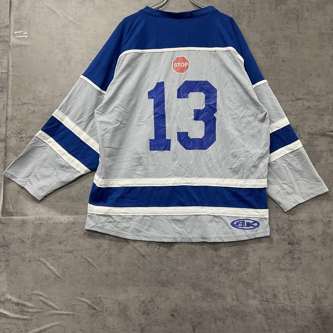 カナダ「Sudbury Minor Hockey Association」仕様のホッケージャージです。ブランドはAthletic Knit (AK)、フロントにはチームロゴ、背面にはナンバリング「13」と特徴的な「STOP」マーク入り。カナダらしいデザインとビッグサイズが魅力で、コレクションやストリートファッションとしてもおすすめです。裾に汚れがありますので、必ず画像をご確認ください。