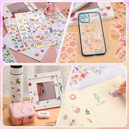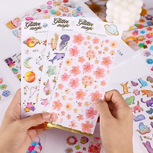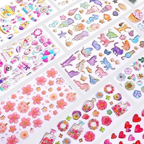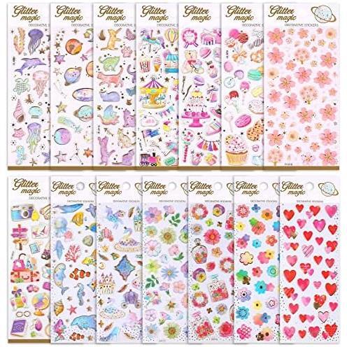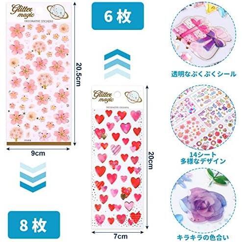 星花と貝殻クラゲ SANNIX キラキラシール 女の子 14シート ごほうびシール 手帳ステッカー ぷくぷく シール キラキラ ハート 立体 デコ ス