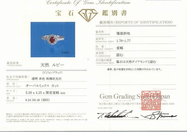 PT900 リング 指輪 11.5号 ピジョンブラッド ルビー 0.54 ダイヤ 0.48 鑑定書 総重量約4.0g 中古 美品 送料無料 | |