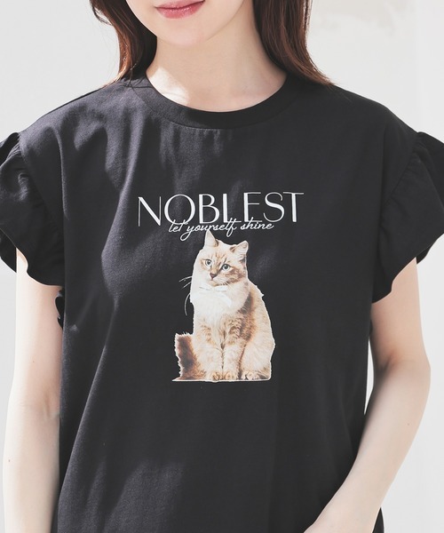 ネコのプリントとフリル袖がかわいいTシャツです。