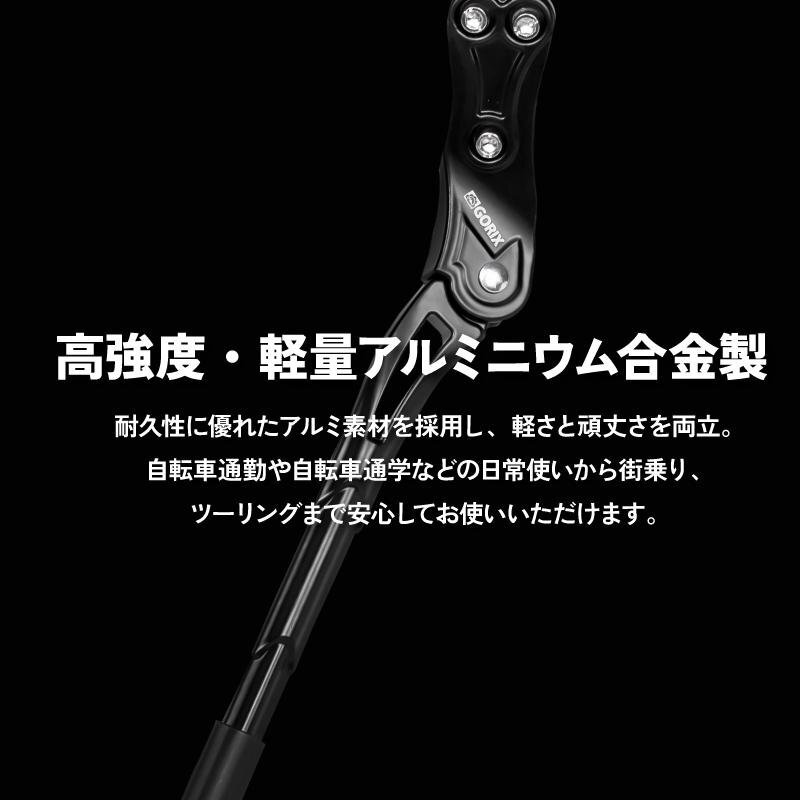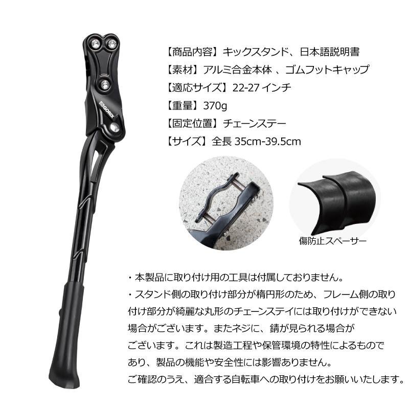 GORIX 自転車用キックスタンド GX-ST166 「簡単取り付け!幅広い自転車に対応するキックスタンド」 手軽に取り付け可能で、22~27インチの幅広い自転車に対応。 ロードバイクやクロスバイク、MTBなど初期スタンドがない自転車にぴったりです。 長さ調整ができるため、自転車に合わせて最適な角度でしっかり支えます。 軽量ながら高強度なアルミニウム合金製で、耐久性も抜群。さらに、地面と接する部分には滑り止め加工を施し、安定感も向上。 シンプルな設計で使いやすく、毎日のサイクリングがより快適になります! 取り付けるだけで、愛車の利便性がグンとアップ! 特徴 ●手軽に取り付けできるモデル ●22-27インチに対応し幅広い自転車タイプに取付け可能 ●長さ調整可能 ●高強度なアルミニウム合金素材を採用し軽量で耐久性を持ち合わせる ●ロードバイクやクロスバイク、MTBなど初期にスタンドがついていない自転車に ●地面と接する箇所には滑り止め加工で安定性が向上 【手軽に取り付け】 複雑な工具は不要!六角レンチ5mmがあれば誰でも簡単に取り付けが可能です。 【22~27インチ対応の汎用モデル】 ロードバイク、クロスバイク、MTBなど、さまざまなタイプの自転車に幅広く対応。 初期スタンドが付いていない自転車に最適です。 【自由に長さ調整】 使用シーンや自転車に合わせて、スタンドの長さを調整可能。しっかり自転車を支えます。 【高強度・軽量アルミニウム合金製】 耐久性に優れたアルミ素材を採用し、軽さと頑丈さを両立。 自転車通勤や自転車通学などの日常使いから街乗り、ツーリングまで安心してお使いいただけます。 【滑り止め加工で安定性あり】 地面と接する部分には滑り止め加工を施し、滑りやすい場所でも安定感を実現。 【商品内容】キックスタンド、日本語説明書 【素材】アルミ合金本体 、ゴムフットキャップ 【適応サイズ】22-27インチ 【重量】370g 【固定位置】チェーンステー 【サイズ】全長35cm-39.5cm 【本製品についても注意事項】 ・本製品に取り付け用の工具は付属しておりません。 ・フレーム側の取り付け部分が丸形のチェーンステイには対応しておりません。スタンド側の取り付け部分が楕円形のため、取り付けができない場合がございます。 またカーボンフレームの自転車には装着できません。ネジに、錆が見られる場合がございます。これは製造工程や保管環境の特性によるものであり、製品の機能や安全性には影響ありません。ご確認のうえ、適合する自転車への取り付けをお願いいたします。 商品は入荷によりキズがある場合があります。 傷や細かい汚れが気になる方や神経質な方は入札をお控え下さい。 入荷時期により予告無く一部仕様変更する場合が有ります。 カラーはディスプレイ種類環境等により実物と異なって見える場合がございます。 |