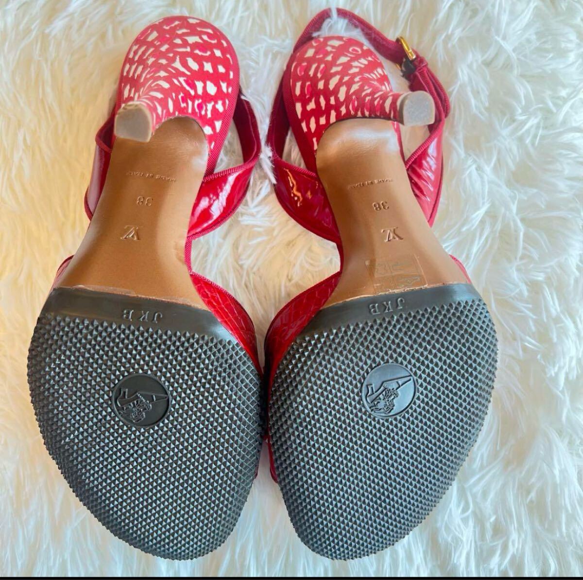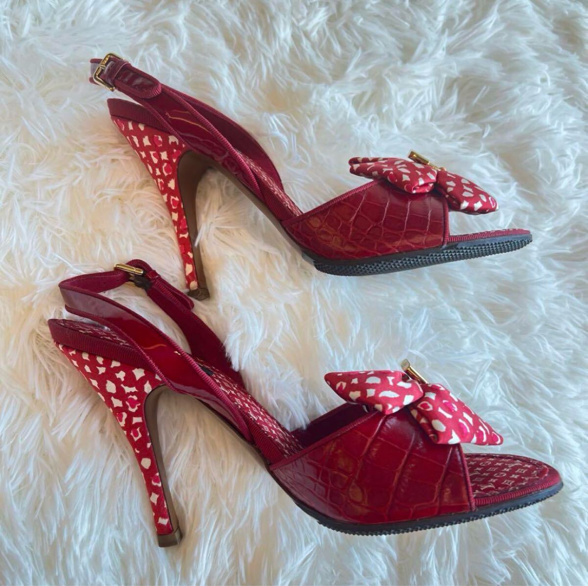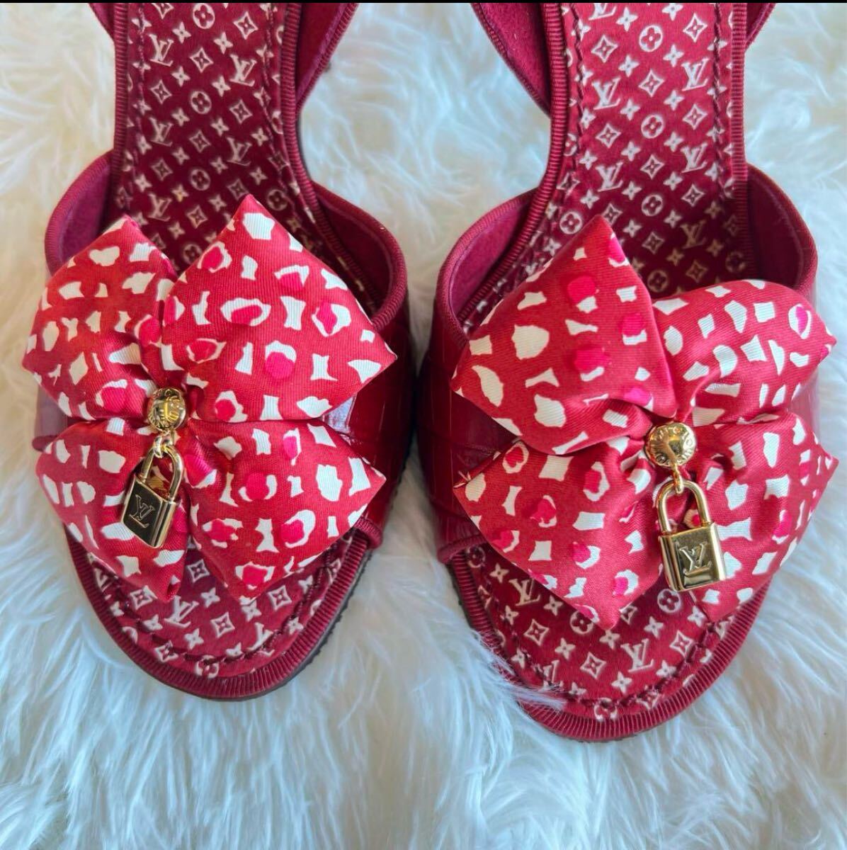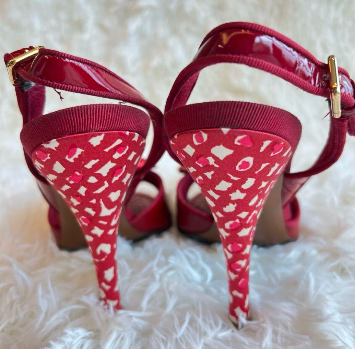 赤いリボンとロックチャームが特徴のサンダル。
