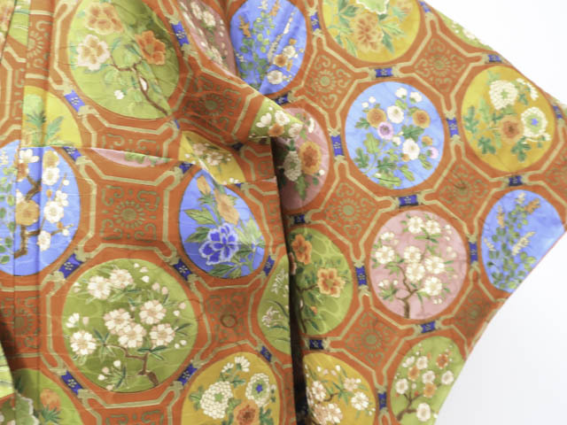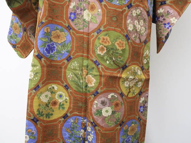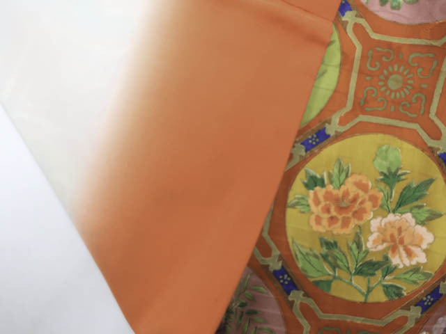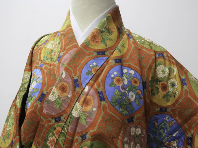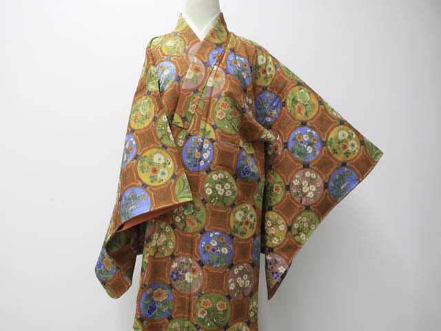 リサイクル商品のため、胴裏にしみがございますがご着用いただけると存じます。 地色は 朱です。 1枚目の画像が近いお色かと思われます。 素材は正絹です。 |