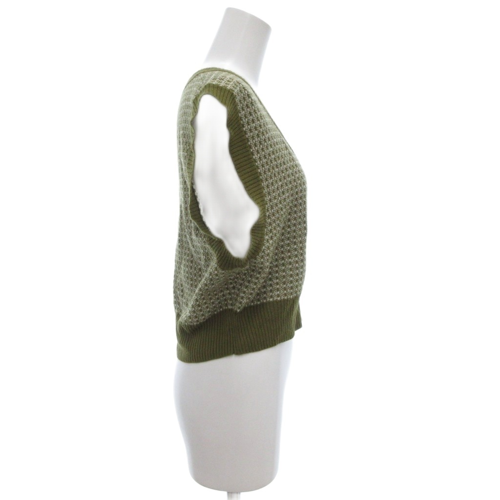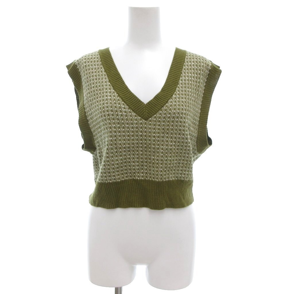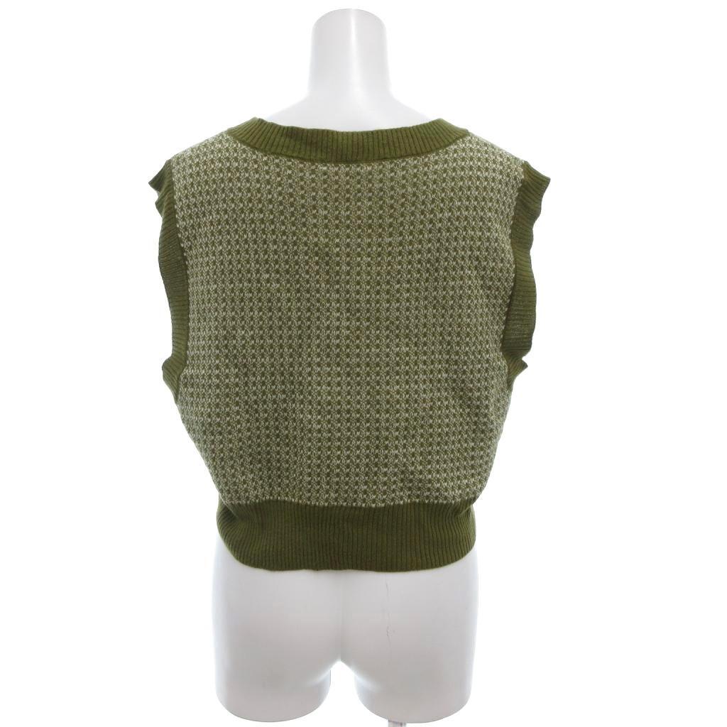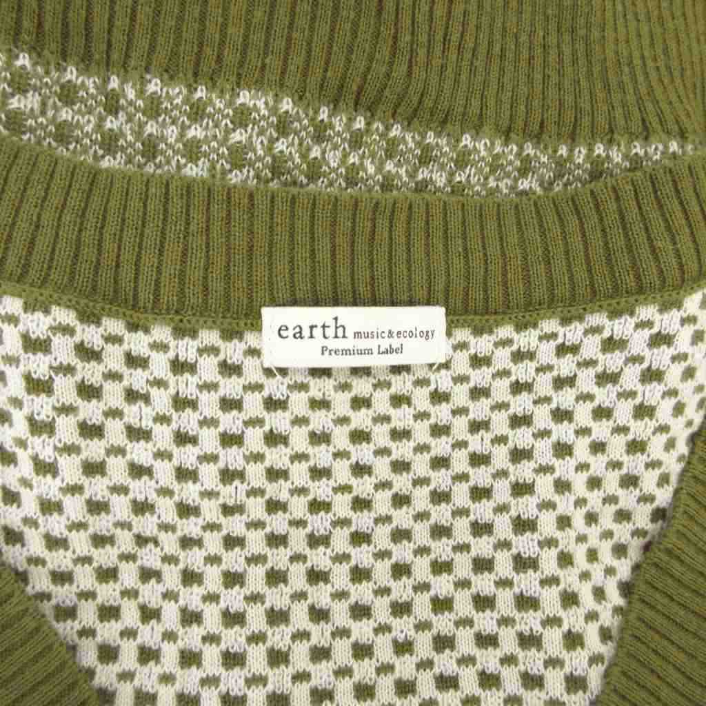 アースミュージック&エコロジー EARTH MUSIC & ECOLOGY 美品 ショートジャガードニットベスト ノースリーブ Vネック 総柄 F カーキ 白