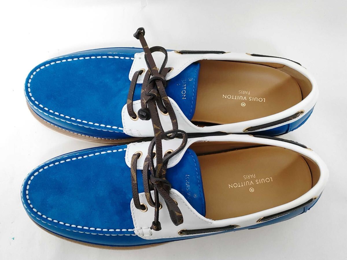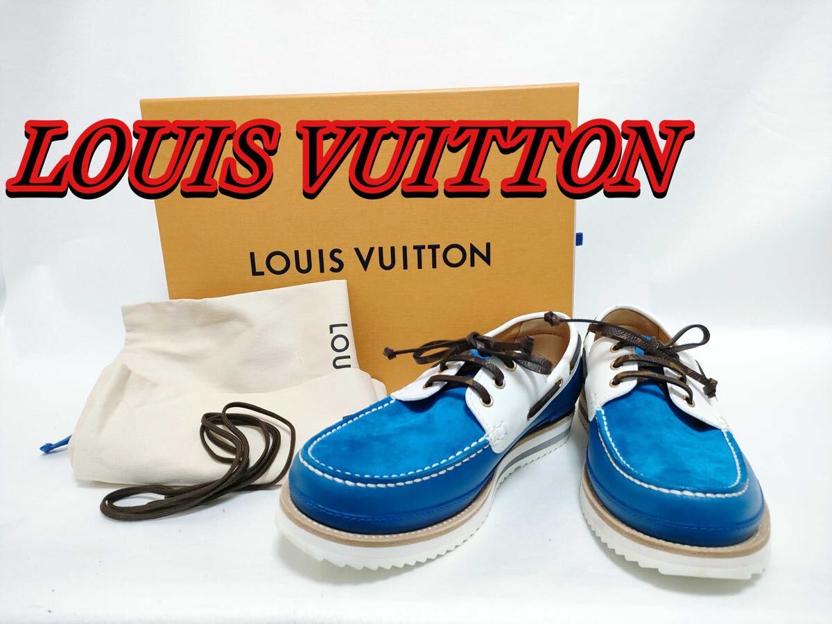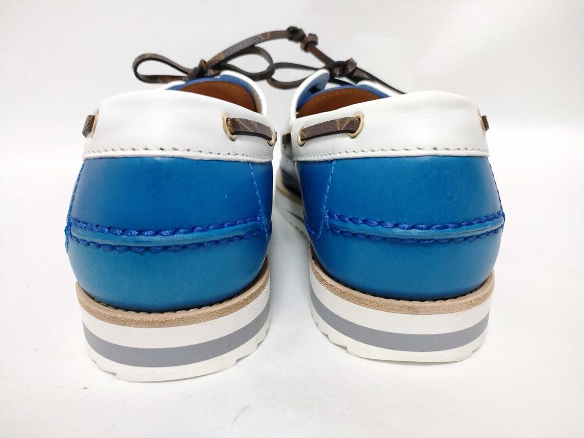 ルイヴィトン(LOUIS VUITTON)の高級感あるデッキシューズです。爽やかなブルー×ホワイトのコンビカラーに、モノグラム柄レザーシューレースを採用したラグジュアリーな一足。