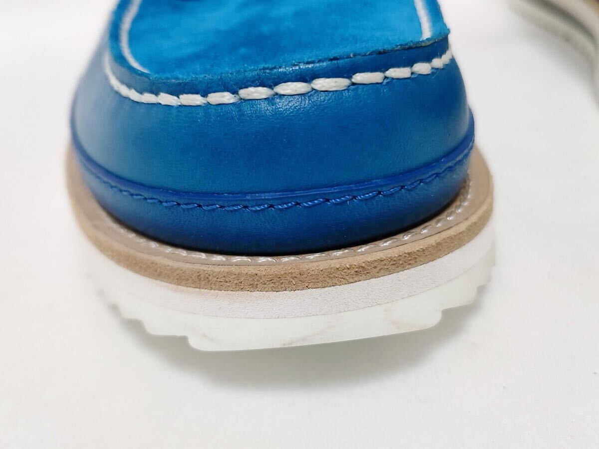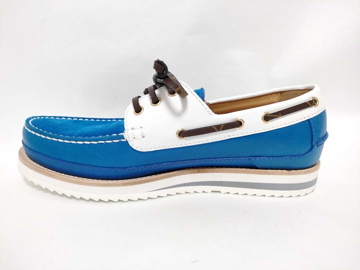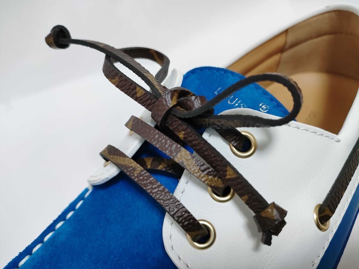 ルイヴィトン(LOUIS VUITTON)の高級感あるデッキシューズです。爽やかなブルー×ホワイトのコンビカラーに、モノグラム柄レザーシューレースを採用したラグジュアリーな一足。