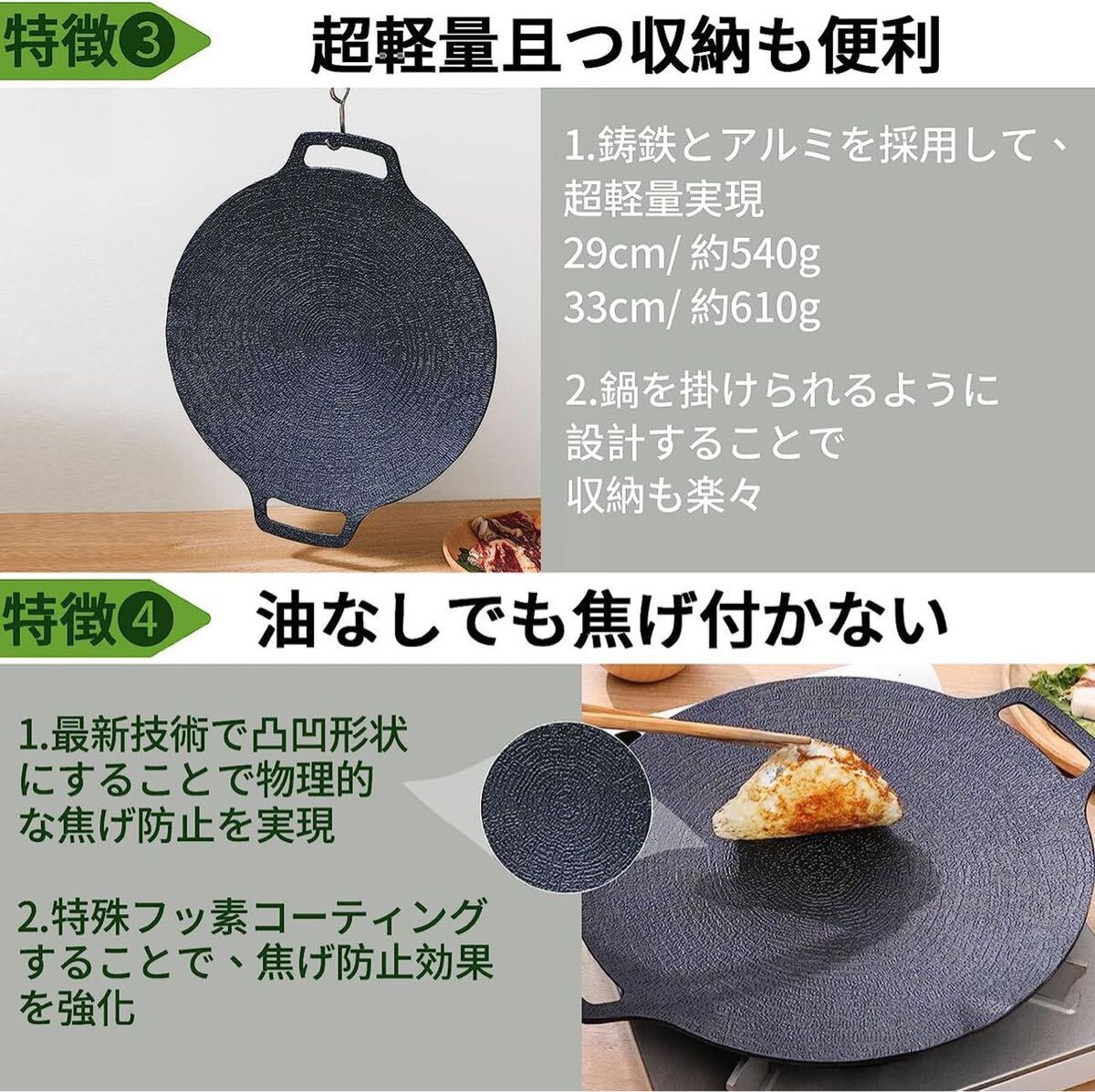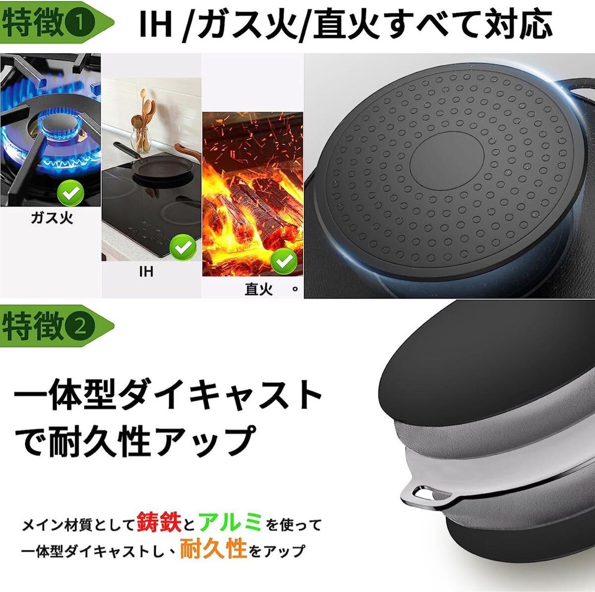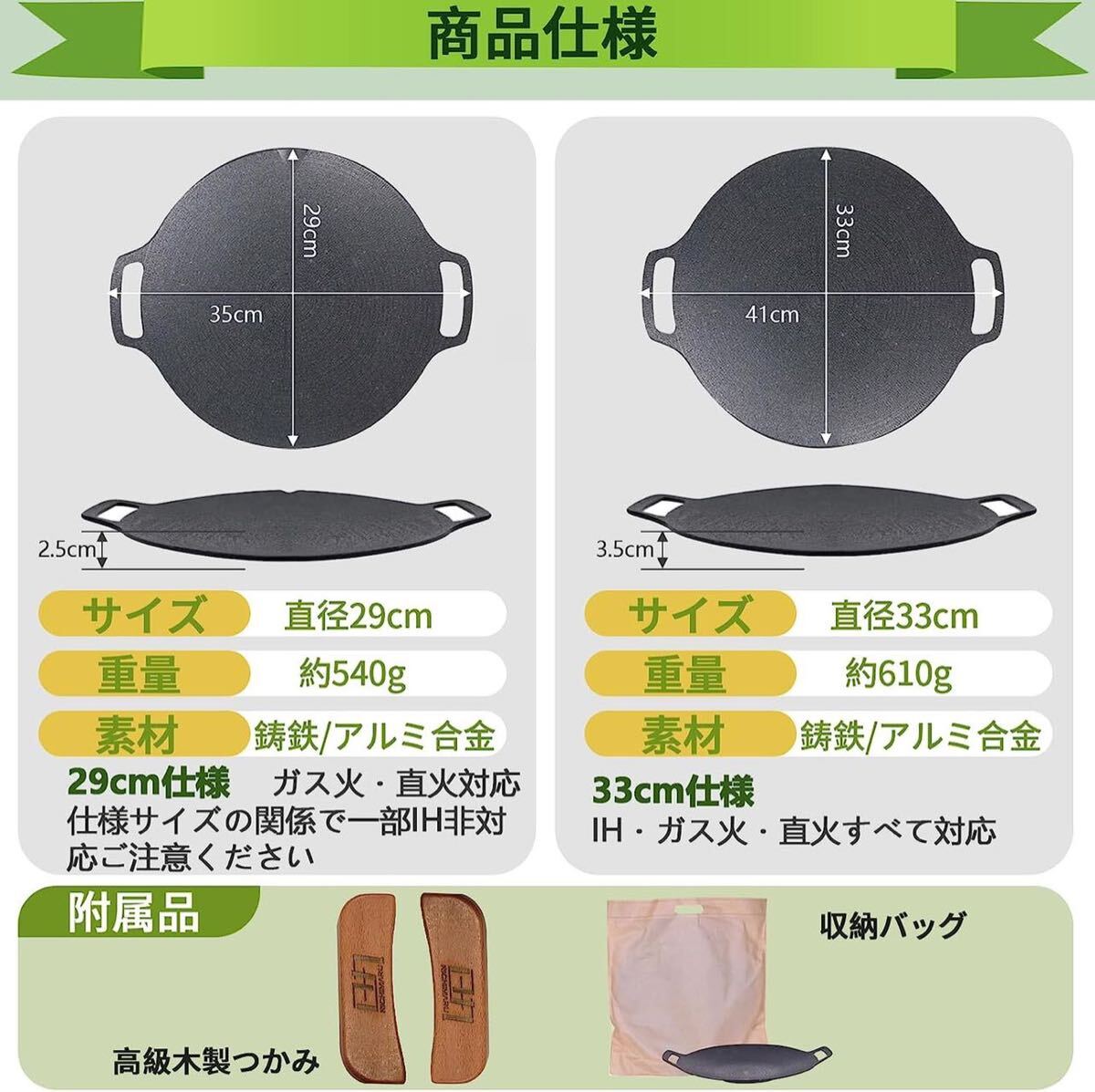 【仕様】直径33cm/重さ約610g。素材:鋳鉄とアルミ合金。詳細はメイン画像をご参考ください。こちら33cmの仕様は、サイズの関係で、一部のIHコンロを対応しない可能性あるので、ご注意ください。ソロキャンプなど1-2人の使用目安としてご参考ください。
