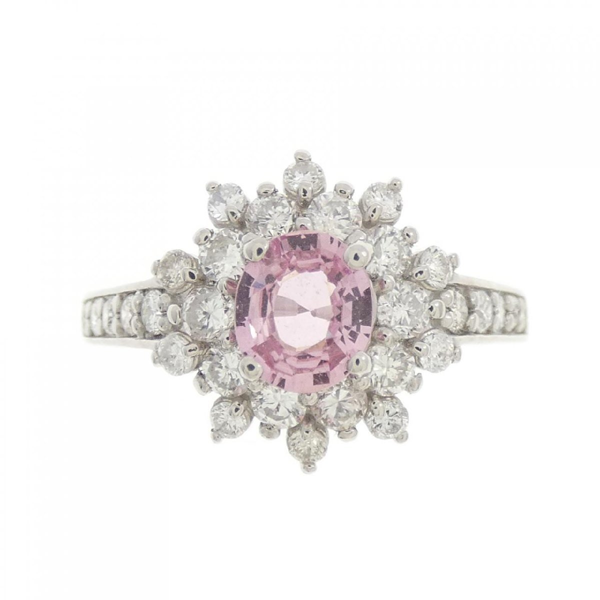 ピンクカラーのサファイヤがあしらわれたリング。クリアに輝くダイヤモンドが周囲を取り巻き、指元を華やかに飾ります。