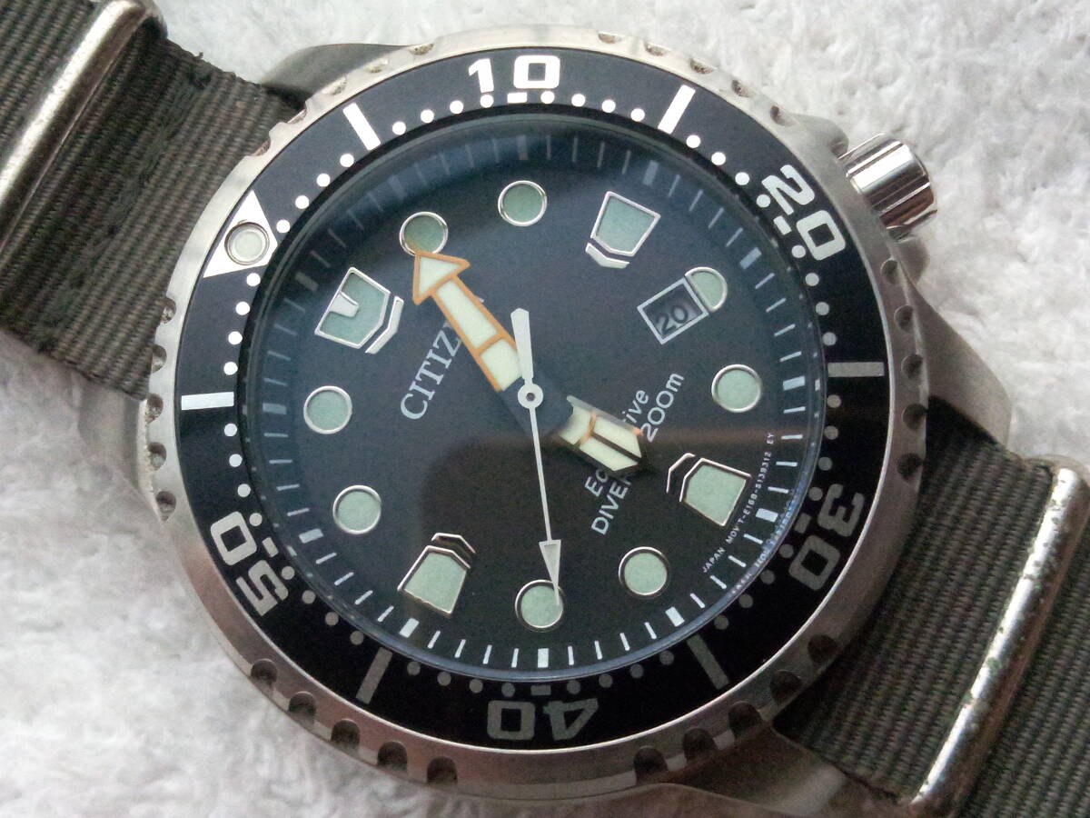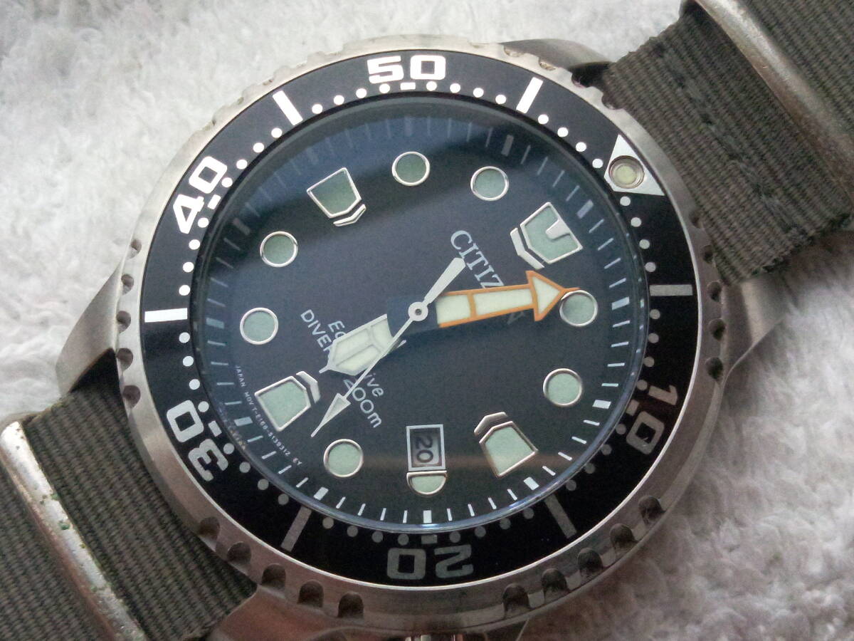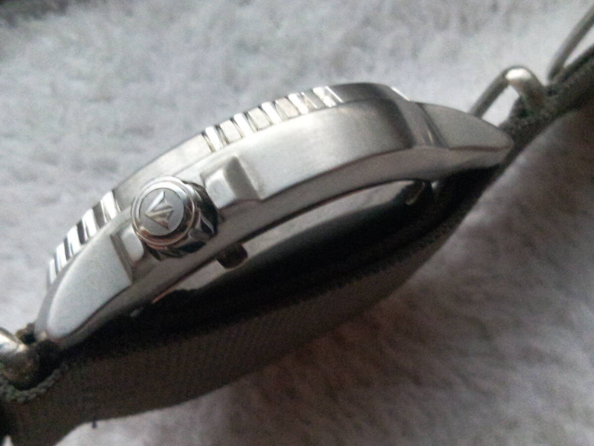 ベゼルやケース裏ブタはきれい。分針のオレンジ色が少し退色しています。ベルトは社外バンドで使用感ありますが普通に使えます。