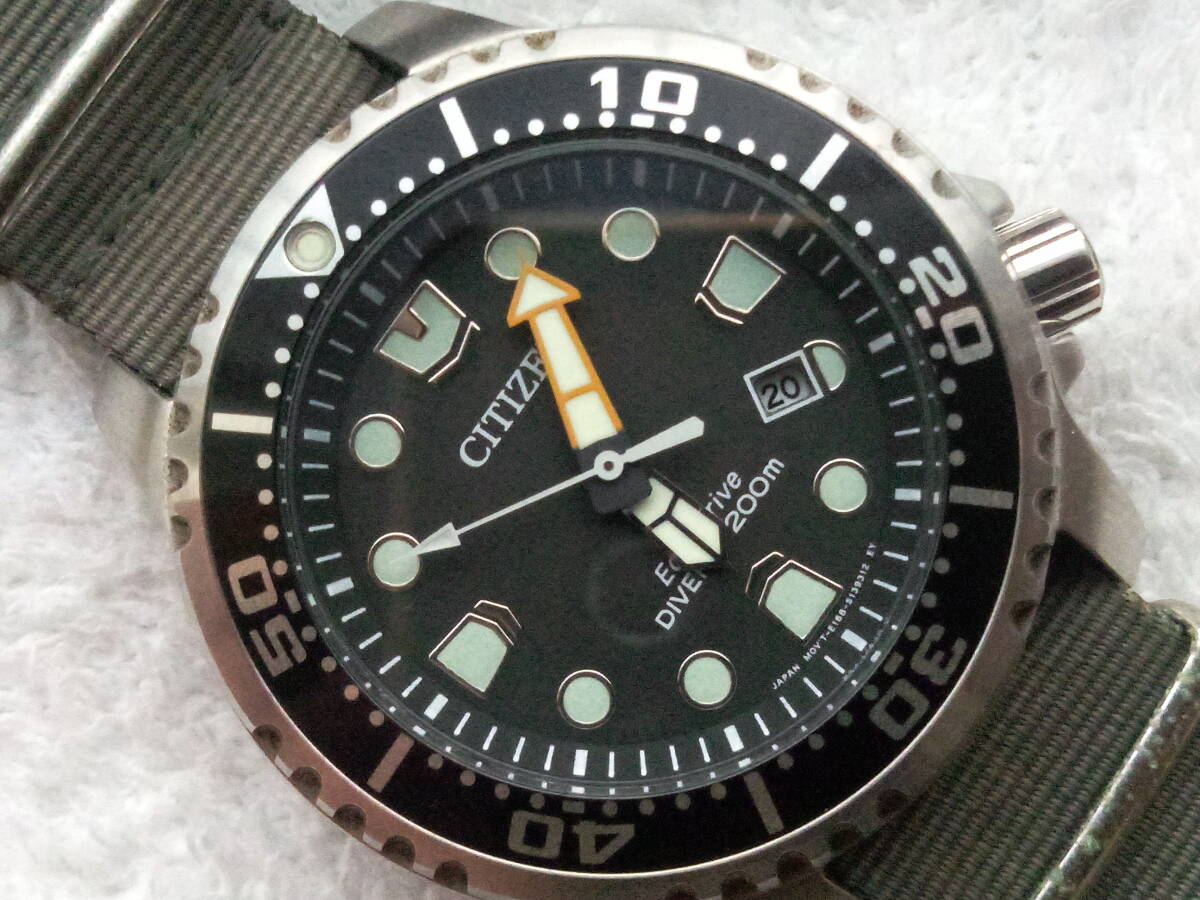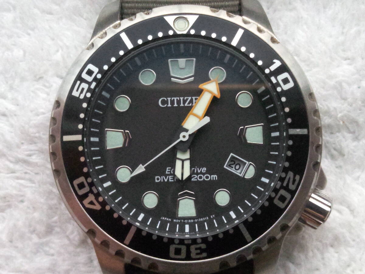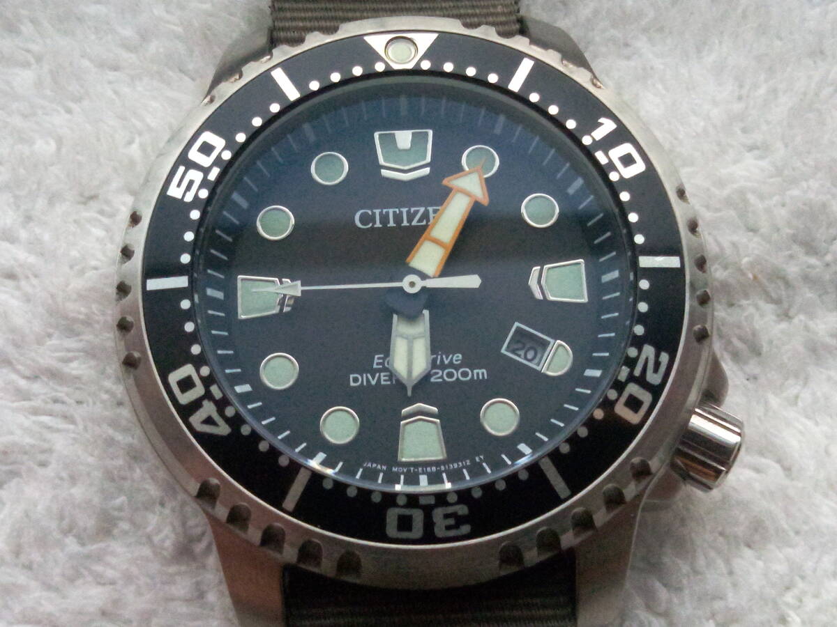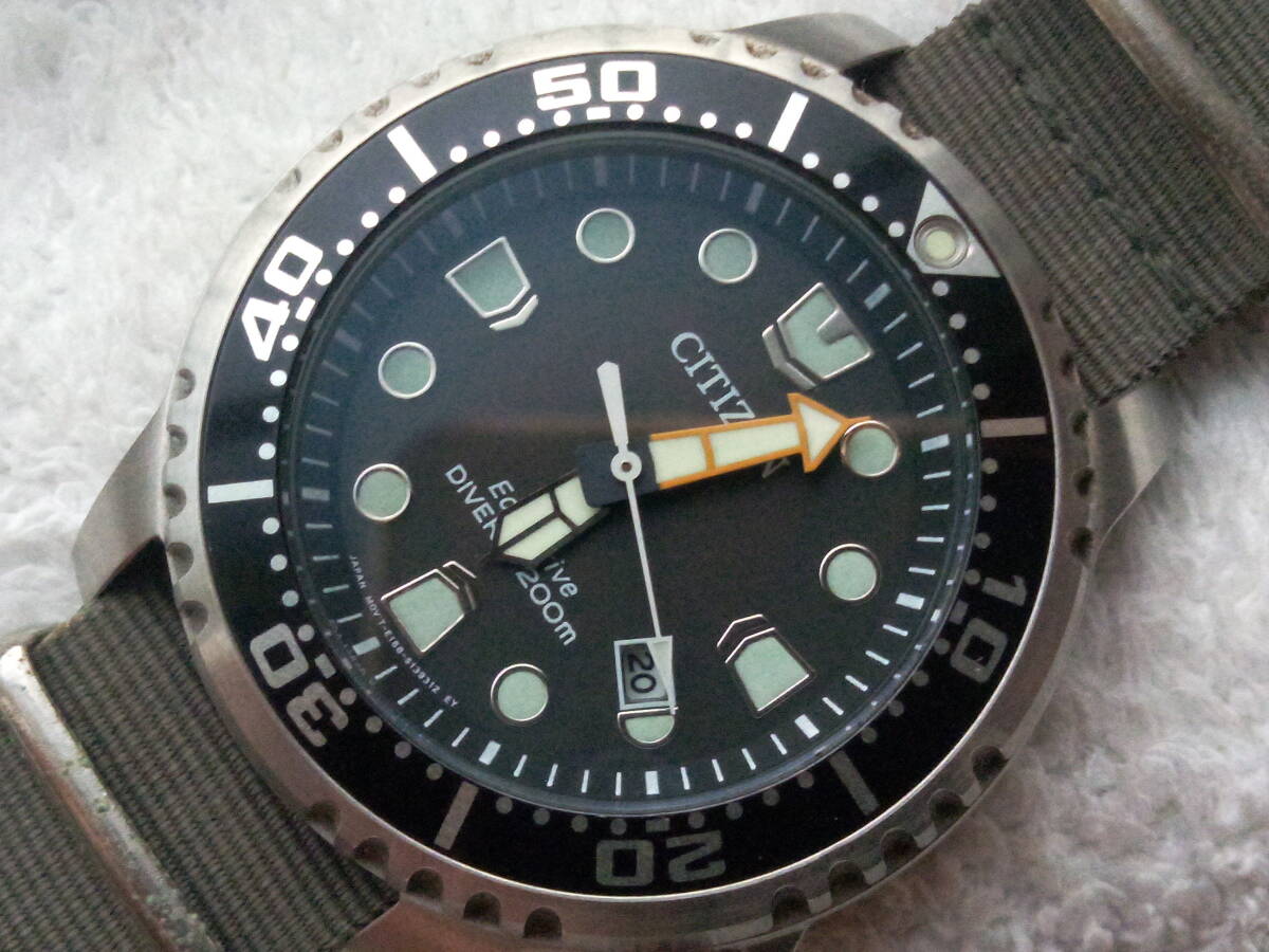 ベゼルやケース裏ブタはきれい。分針のオレンジ色が少し退色しています。ベルトは社外バンドで使用感ありますが普通に使えます。