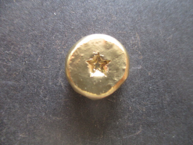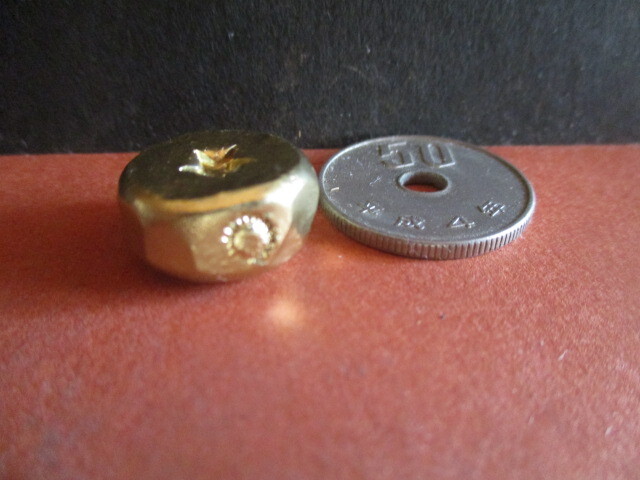 知人の身辺整理を手伝うことになりました。入手先や入手価格を思い出せないものから順に処分する予定です。旧帝国陸軍の特務機関が南支(現在の中国南部)および仏印(フランス領インドシナ=現在のベトナム・ラオス・カンボジア)での諜報工作活動の際に使用したと伝えられている金塊です。有名な丸福金貨伝説のモデルになったとも言われています。小役人の買収には手ごろな大きさです。革袋に詰めれば大きな取引にも使えそうです。刻印は「桜」と「星」の2種が確認されていますが、こちらの刻印は2枚目の画像の通りです。側面には小さな「蛇の目」の刻印も認められます(1枚目の画像)。わずかに黒ずんだ部分がありますが、変色なのか、不純物の露出なのか、出品者には判断できません。状態についての詳細情報は画像でご確認ください。撮影の際の光の量によって実物と違った色に写ることがあります(1枚目の画像が最も実物の色に近いように思います)。タイトルに記載した量目は写真撮影の際に先方(委託者)宅で測定した値です。計量器の誤差は0.2g以内と聞いています。金品位を記載した保証書が見当たらないとのことですので、トラブル防止のためあえてレプリカ・メッキ品として出品させていただきます。金品位が著しく低い場合や金が全く含まれていない場合でもお許しいただける方のみご入札ください。50円硬貨は商品に含まれません。高騰防止のために即決価格をご用意しました。自己紹介欄にオークション休業日を記載させていただいております。お手数とは存じますが、ご入札前にお読みいただければ幸いです。よろしくお願い申し上げます。