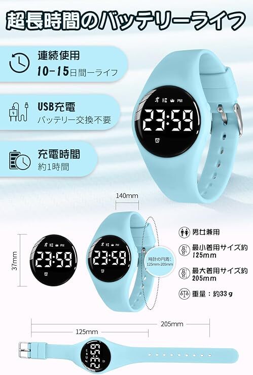 [USB充電式-長持ちバッテリー]:充電式 デジタル腕時計は便利な充電式のデザインを採用しており、使いやすく、電池交換も必要ありません。高品質バッテリーを採用しており、寿命が長い。腕時計の文字盤を直接usbアダプタに差し込むだけで充電ができ、充電器を紛失する心配はありません。通常は1時間充電して、10~15日程度ご利用できる。