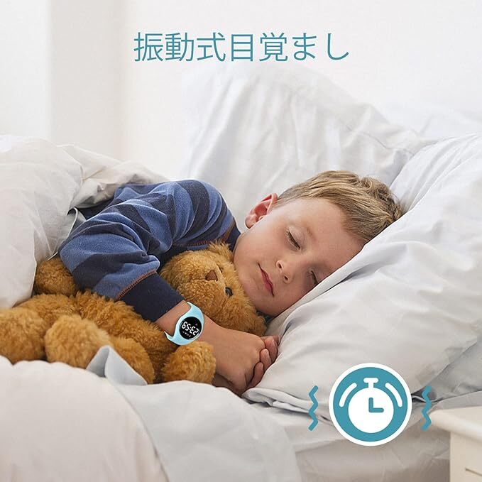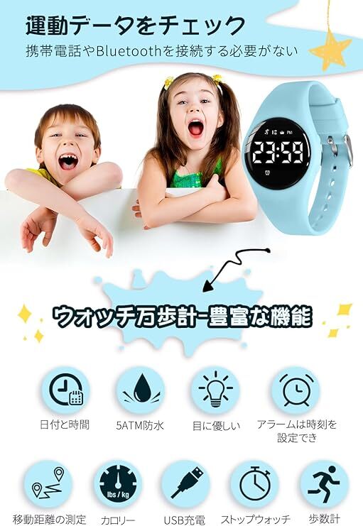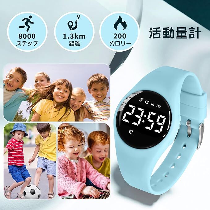 [子供用腕時計と活動量計]:スポーツ時計として使用できる。歩数計、歩行距離、カロリー、ストップウォッチ、目覚めし、日付曜日表示の機能を搭載し、携帯電話に接続することなく使用できるミニのスマートウォッチ。