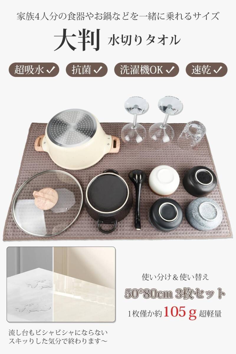 • 【まるで大きめ調理器具の福音】大きな鍋やフライパンとか洗った後、食洗機などに入れられないし、水切りかごにも入れられない場合もよくあるのではないでしょうか。一枚の水切りタオルを敷きておけば、洗った食器や鍋を乗せてもベチャベチャになりません。それに、水切りかごと違って広げたり折りたたんだり大きさも調整できるので、とても使いやすいです。