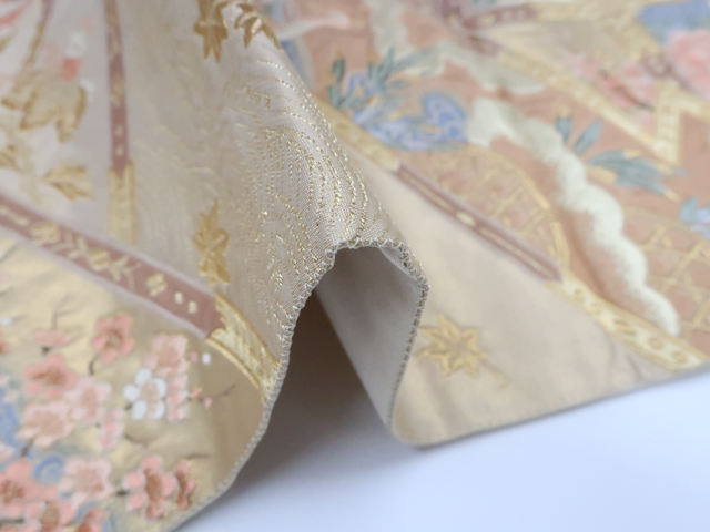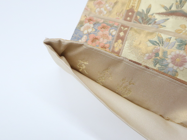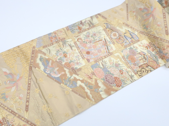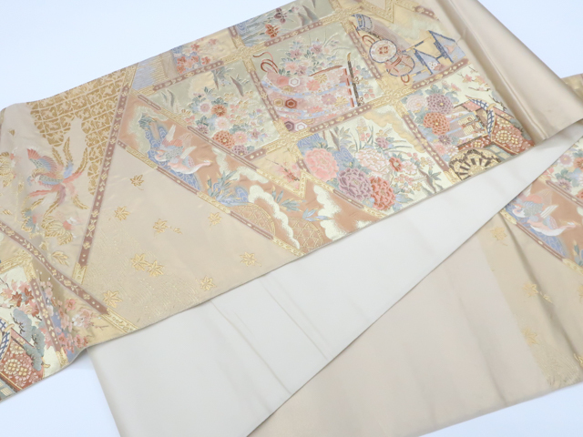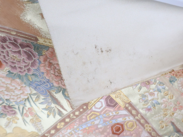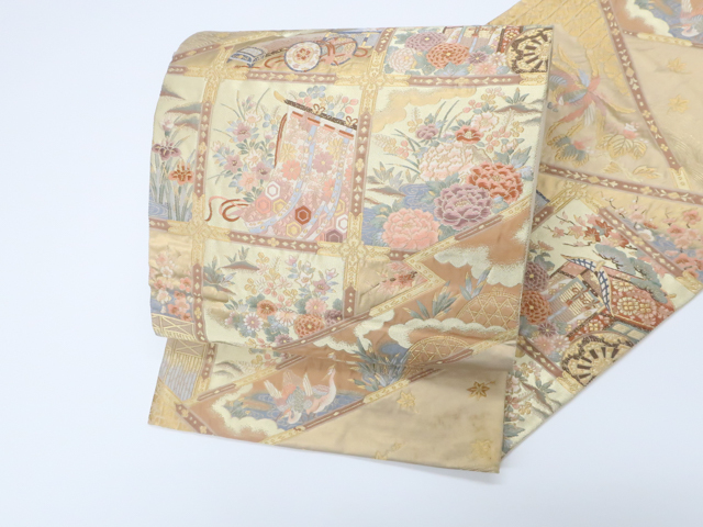 リサイクル商品の為、垂れ先、垂れ先裏に汚れ、無地場や表の所々に薄汚れやスレがございますがご着用いただけると存じます。 地色はベージュ・金です。 1枚目の画像が近いお色かと思われます。 素材は正絹です。 |